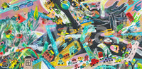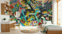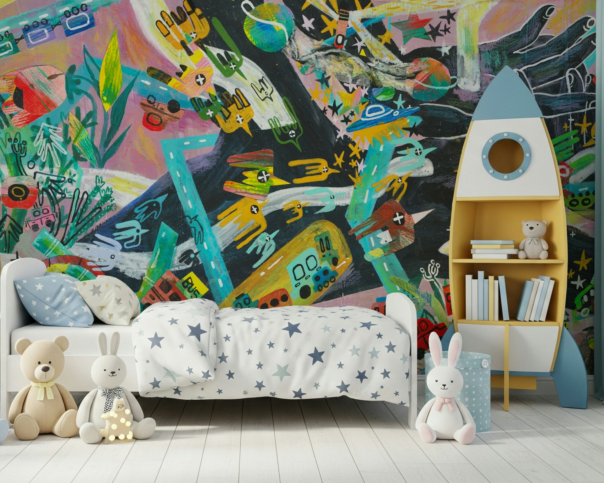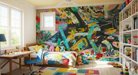 Embrace vibrant energy with this abstract cityscape wallpaper for walls. Bursting with lively colors and whimsical details, the design features cars, roads, planets and birds! This playful creation instantly enlivens any space. Let it transform kids rooms, play areas, or studio walls. The unique artistic style creates an imaginative atmosphere, making it a striking statement piece that captivates and inspires. It blends youthful charm with modern art, enhancing interior decor.