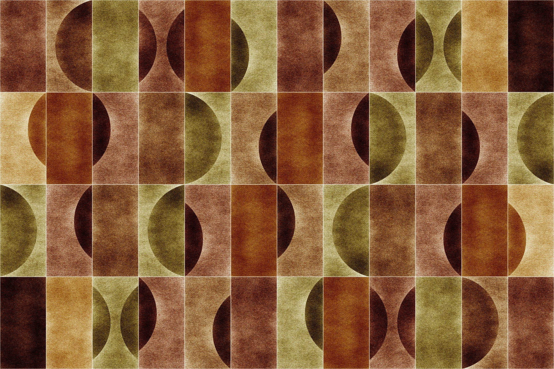Dive into the intriguing depths of 'Velluto Gloomy Geometry', a wallpaper that blends the tactile allure of velvet with the structured elegance of geometric forms. This design evokes a sense of quiet contemplation, featuring semi-circular shapes and rectangles arranged in a captivating, repeating pattern. The muted, earthy palette, dominated by shades of brown, beige, and hints of muted green, creates a somber yet sophisticated atmosphere. The texture, reminiscent of fine velvet, adds a layer of richness and depth, drawing you into the gloom. Perfectly suited for spaces seeking a touch of understated drama, 'Velluto Gloomy Geometry' transforms walls into canvases of thoughtful design, imbuing your surroundings with a unique and introspective character. This wallpaper provides a modern statement that speaks volumes without uttering a sound, making it ideal for studies, lounges, or any area deserving of a refined, melancholic charm.