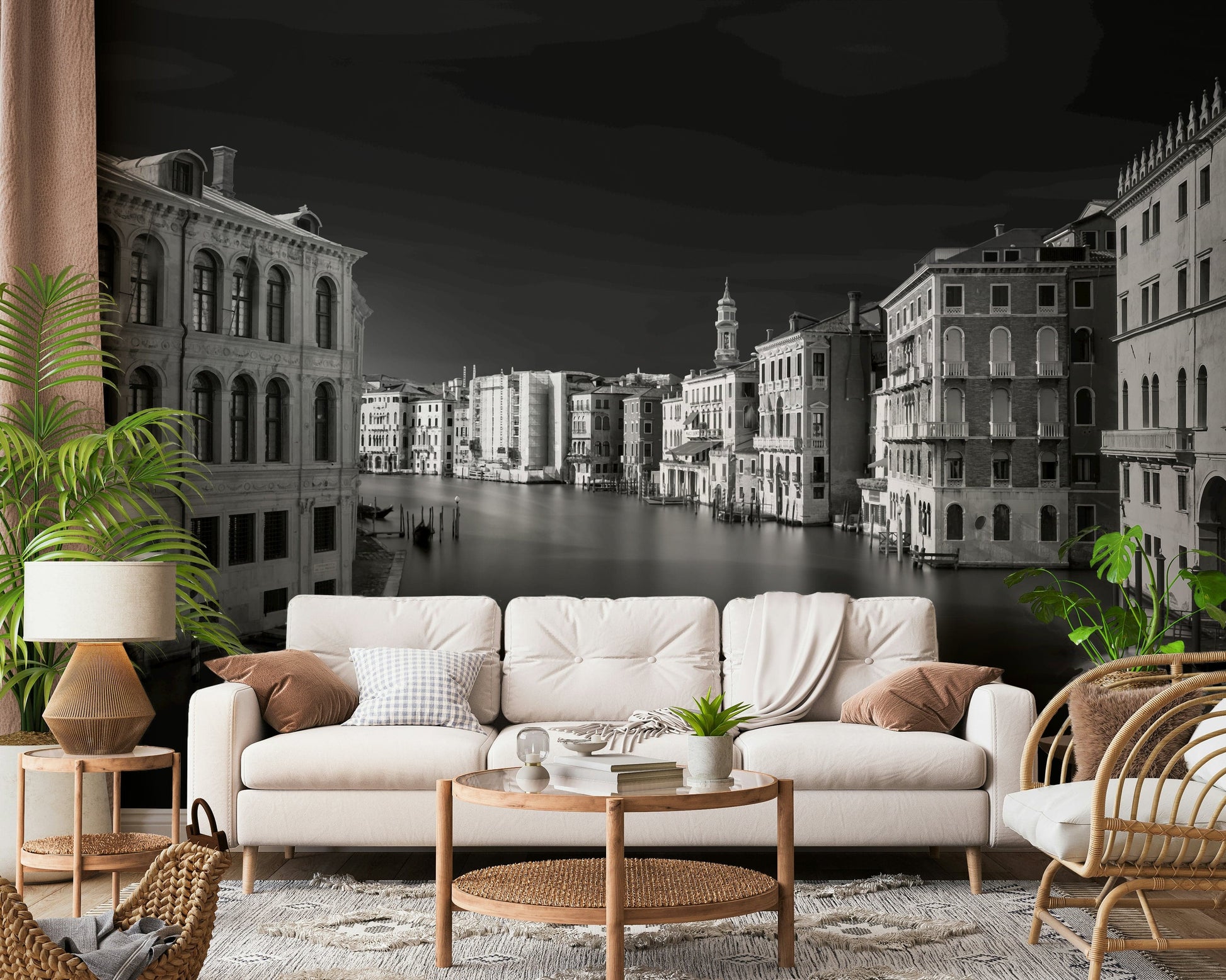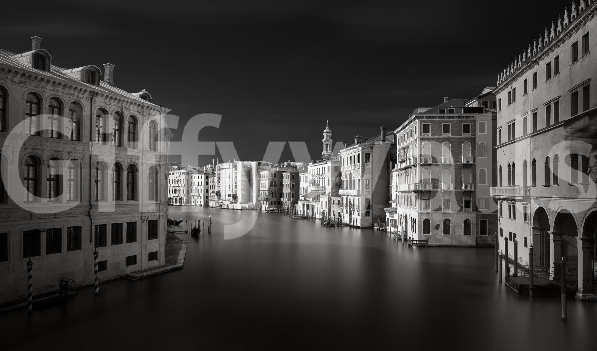 This wallpaper for walls presents a captivating monochrome view of Venice. The image captures the city's timeless beauty, featuring its historic buildings and serene waterways. The elegant grayscale palette complements various interiors, from modern minimalist spaces to classic studies. Bring a touch of Italian charm and sophistication to your living room, bedroom, or office with this striking design. Its neutral tones create a calm atmosphere.