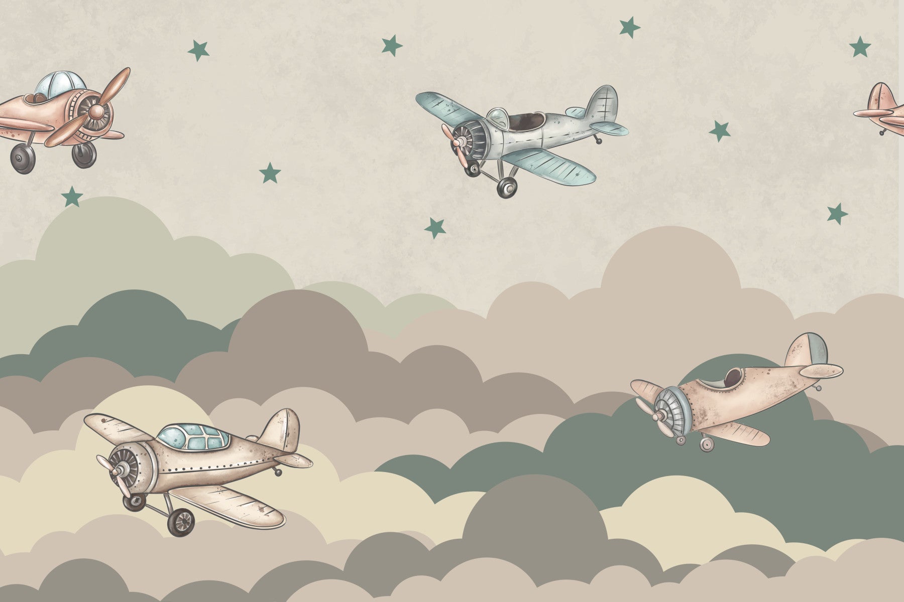 Transform a space with this delightful wallpaper for walls that features vintage airplanes gracefully navigating a sky of soft clouds and twinkling stars. The gentle color scheme of muted beiges, subtle greens, and calming blues create a peaceful setting suitable for children’s rooms, nurseries, and even a home office seeking a touch of whimsy. The design fuels imagination, inspiring stories of flight and exploration, harmonizing seamlessly with interiors.