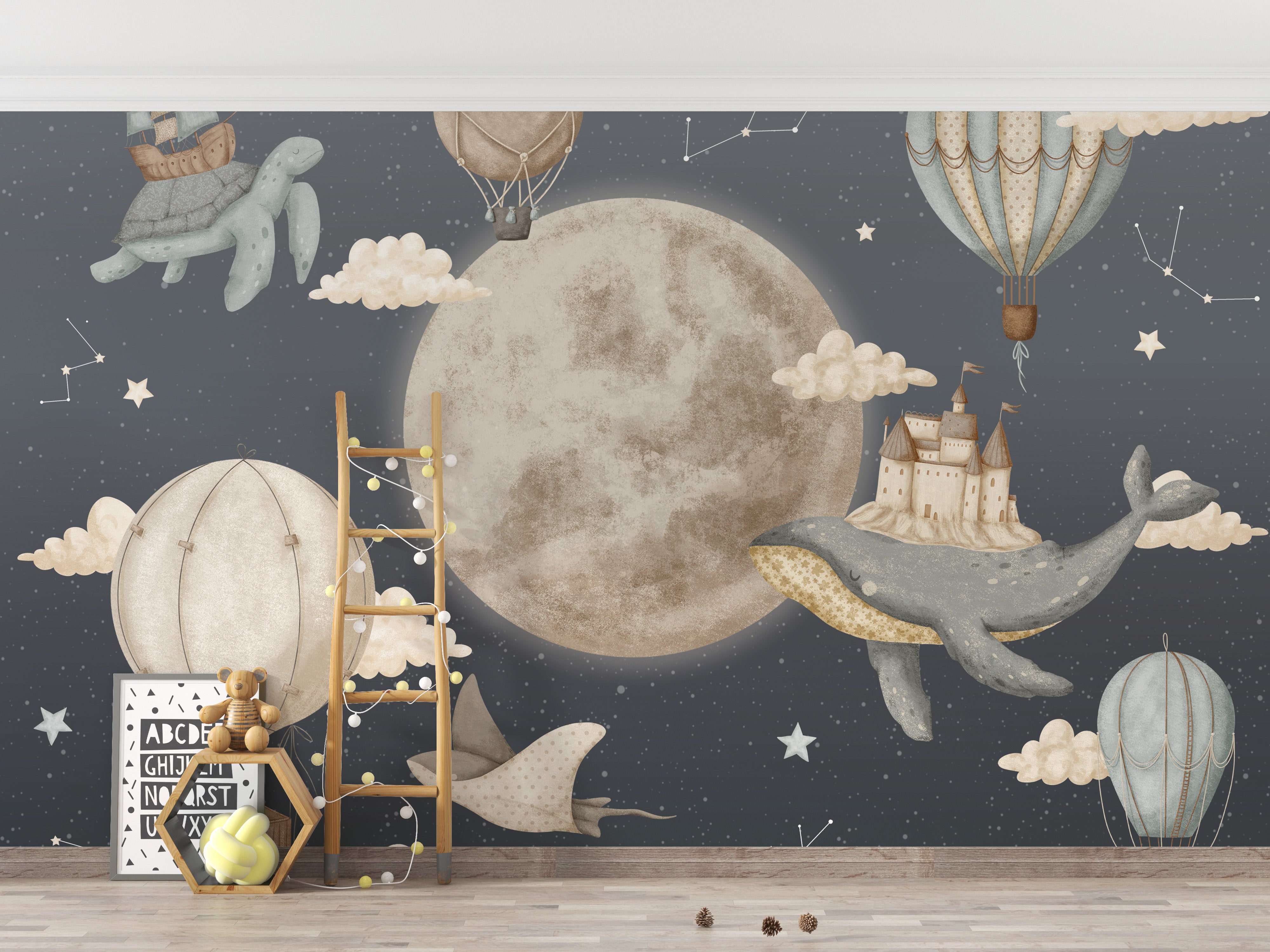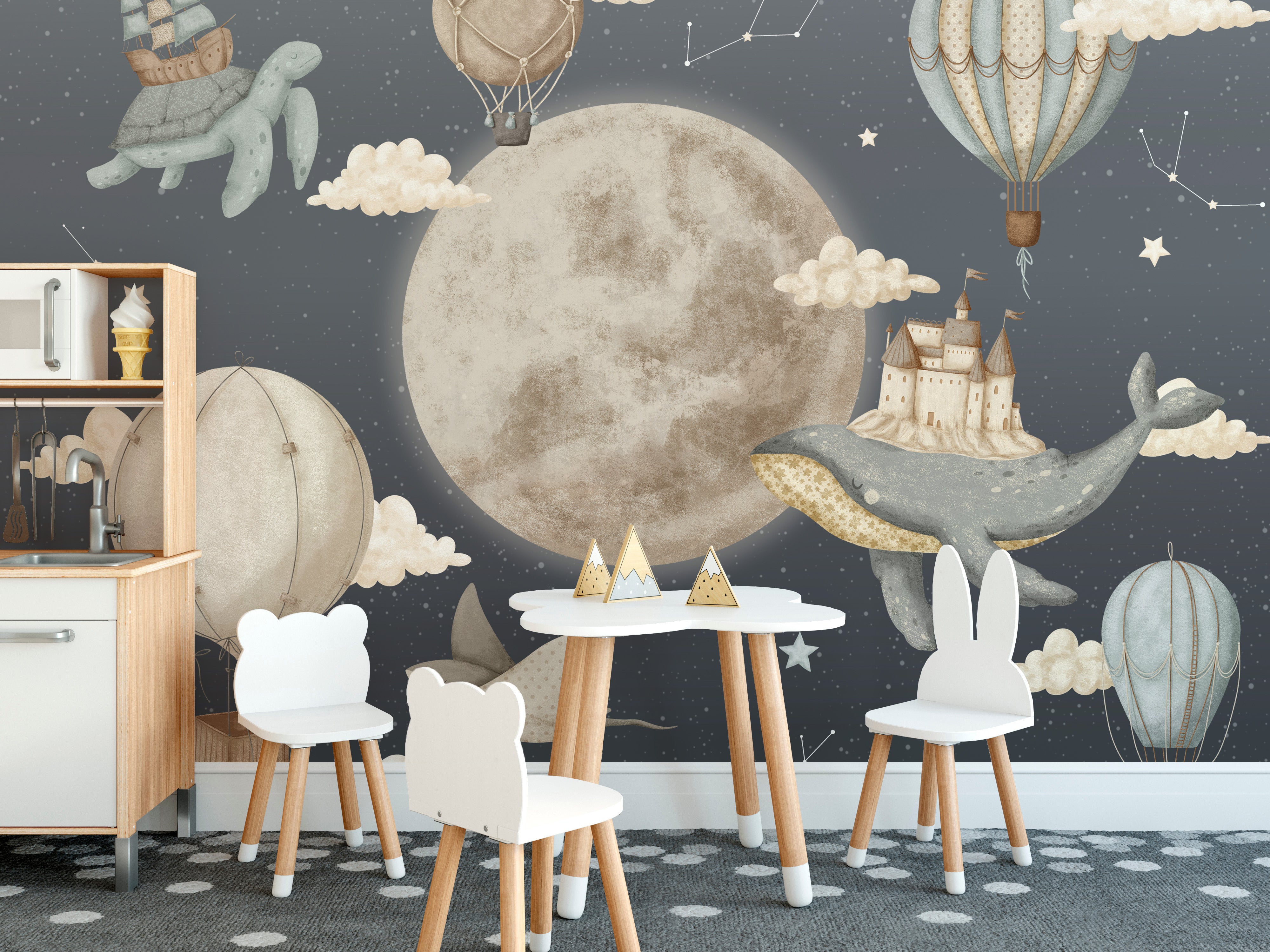 Hot air balloon wallpaper mural for unique kids' spaces.