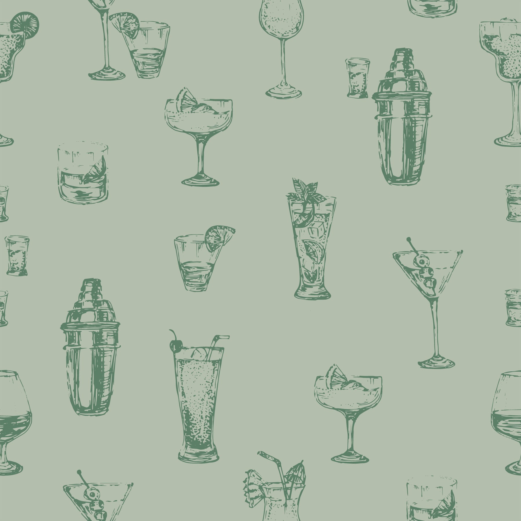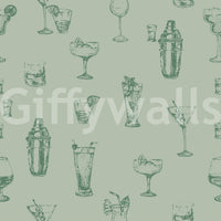 Step into a world of timeless elegance with this vintage-inspired wallpaper. Featuring a charming repeat pattern of hand-sketched cocktail glasses and shakers, this design exudes old-world charm and sophistication. The calming sage green color scheme offers a soothing and relaxing atmosphere, while the detailed illustrations add a touch of whimsy and character. This wallpaper is perfect for adding a touch of vintage flair to your home bar, restaurant, or any space that appreciates a blend of classic style and modern appeal. It's a visual treat for anyone who enjoys the art of mixology and the charm of bygone eras.