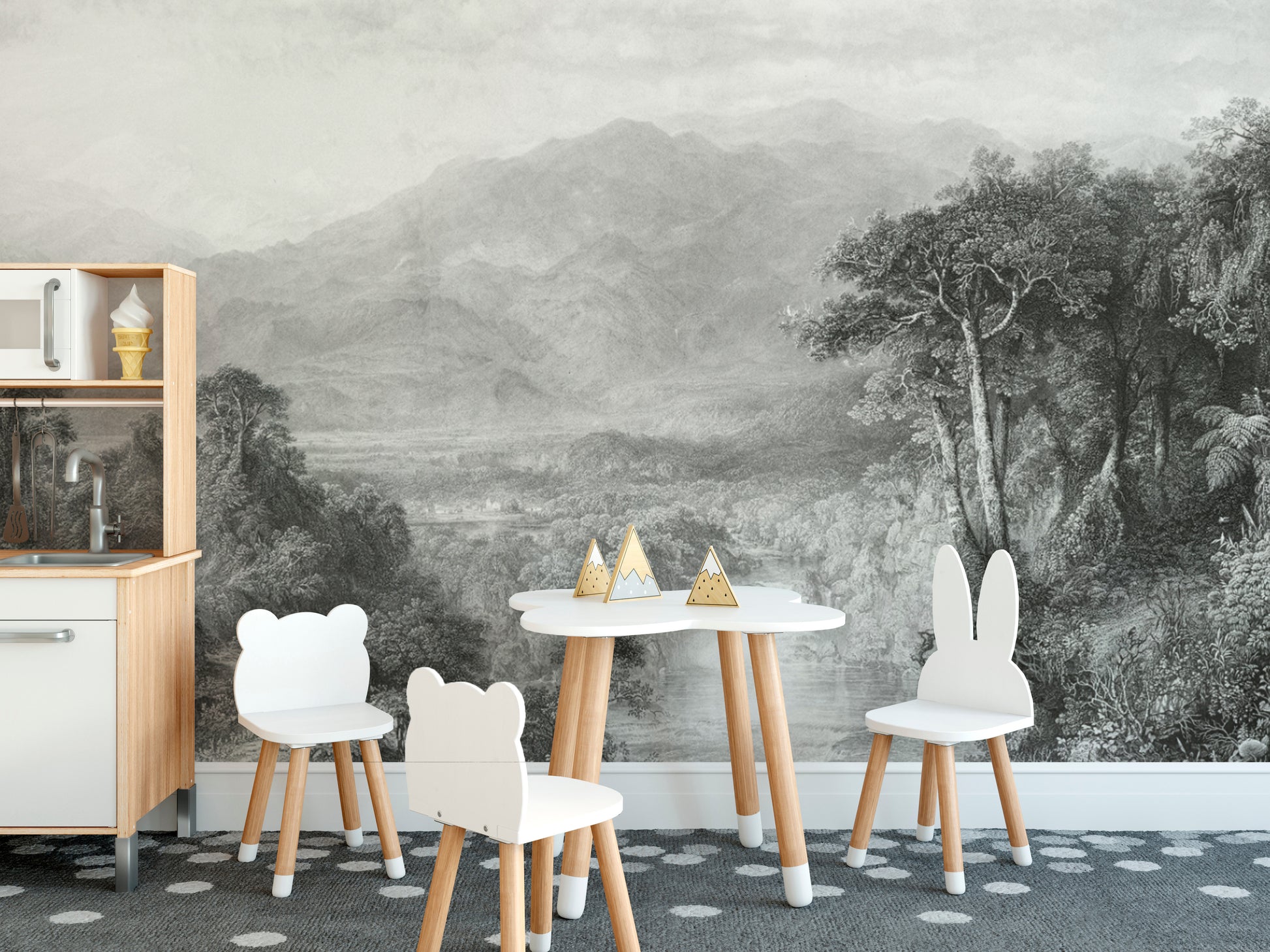 Antique-style forest and mountain wallpaper for decor