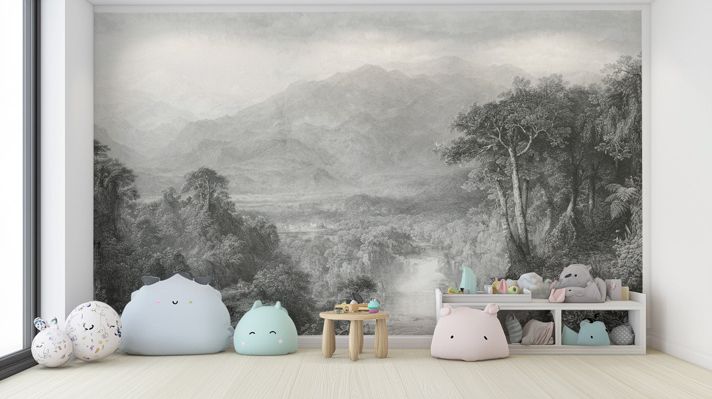 Update the look of your room with the vintage black-white landscape wallpaper, which carries a complex grey-scale landscape scene that possesses grace and class. This traditional scene mural creates stunning views of mountains, forests, and waterfalls in the look of woodcut, ideal as an interior decoration with space and grace. Whether enhancing a living room, study, or office, this antique nature artwork wallpaper blends effortlessly with both modern and traditional decor. Up your walls with this artful forest depiction wallpaper and add timeless charm to a historic scenic landscape to your home decor. Ideal for those who love vintage-inspired décor.