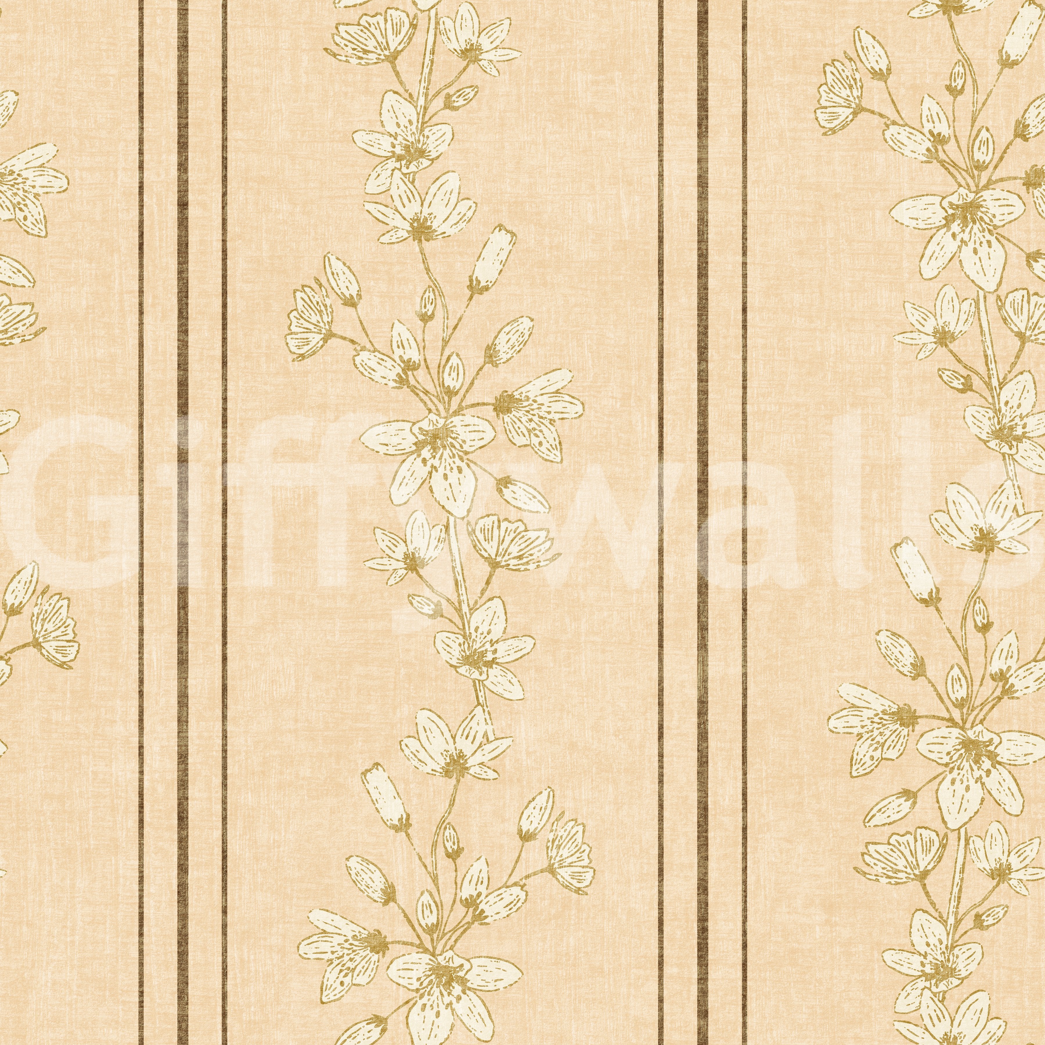 Embrace a touch of vintage elegance with this wallpaper featuring delicate, hand-drawn floral motifs in soft off-white against a warm, pale yellow background. The design incorporates vertical stripes in a subtle brown hue, providing a charming contrast that enhances the overall aesthetic. The artistic, slightly distressed floral illustrations evoke a sense of nostalgic charm, perfectly capturing the essence of 'vintage bloom'. This wallpaper is ideal for creating a serene and sophisticated ambiance in any space, bringing a touch of classic beauty to your home decor.