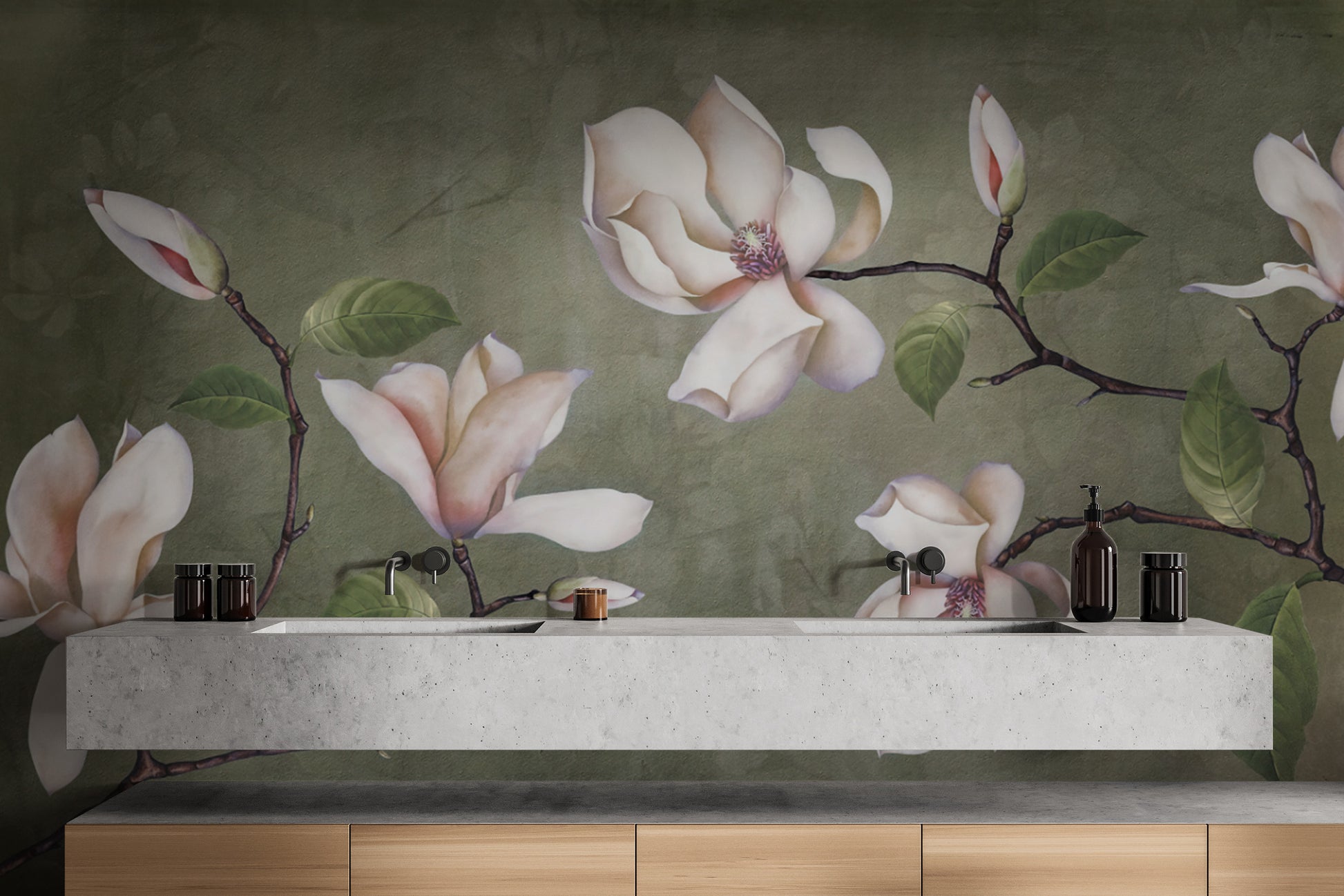 Dive into a timeless aesthetic with our vintage blossom peel-and-stick mural wallpaper. Crafted with intricate attention to detail, this wallpaper exudes a green color palette that breathes life into any space. Adorned with delicate floral designs, it captures the essence of classic flower wallpaper, making it the perfect choice for those seeking a blend of tradition and contemporary style. Easy to apply and remove, this mural transforms your walls into mesmerizing gardens. Experience elegance and nature harmoniously intertwined with this green flower wallpaper.