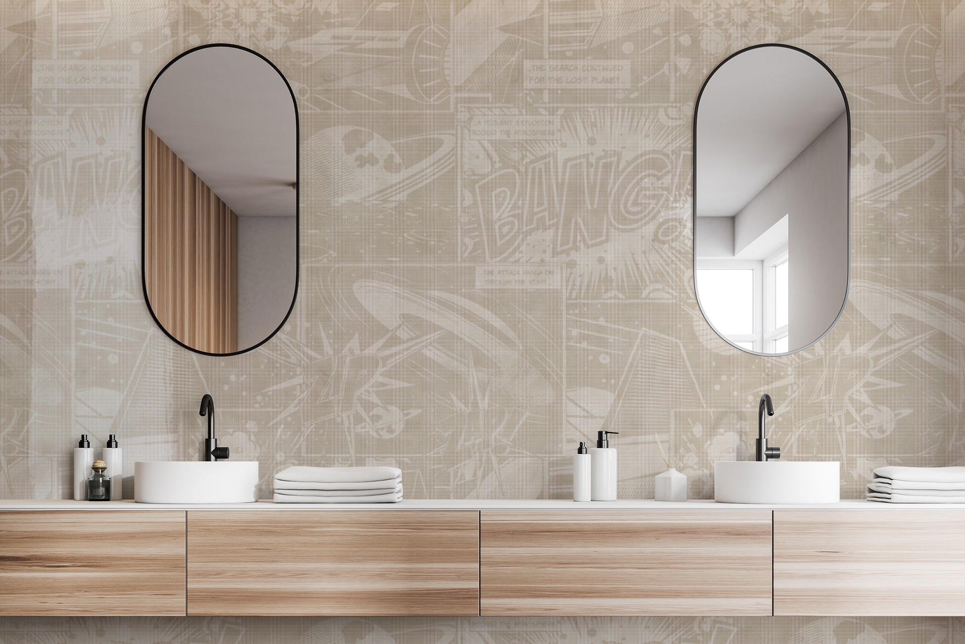 Update your space with the vintage comic space adventure wallpaper, a harmonious mix of retro space wallpaper and traditional comic art. Featuring dynamic comic strip wallpaper patterns with rockets, planets, and bold "BANG!!". Typography: this design creates a nostalgic modern look with a futuristic feel to its interiors. The beige textured wallpaper finish provides a timelessness and is suitable for children's rooms, computer gaming/media centers, or art studios. Augment your interiors with this sci-fi comic wallpaper for those who love space and vintage stuff. This monochrome comic-pattern wallpaper is a real attention-getter!