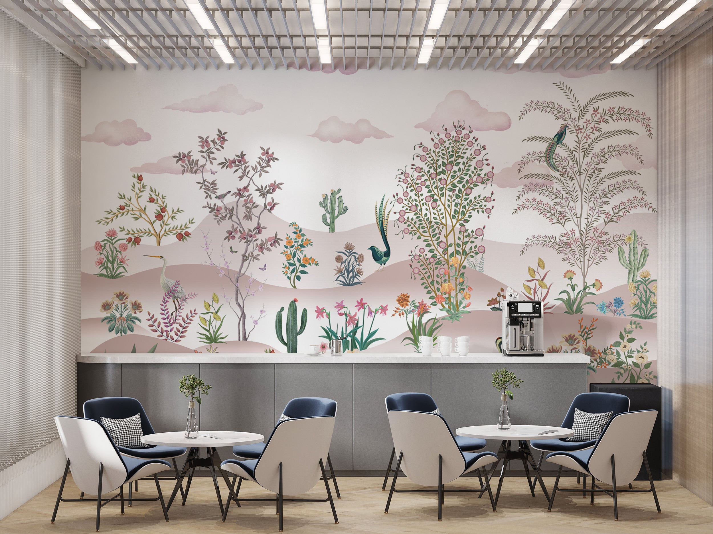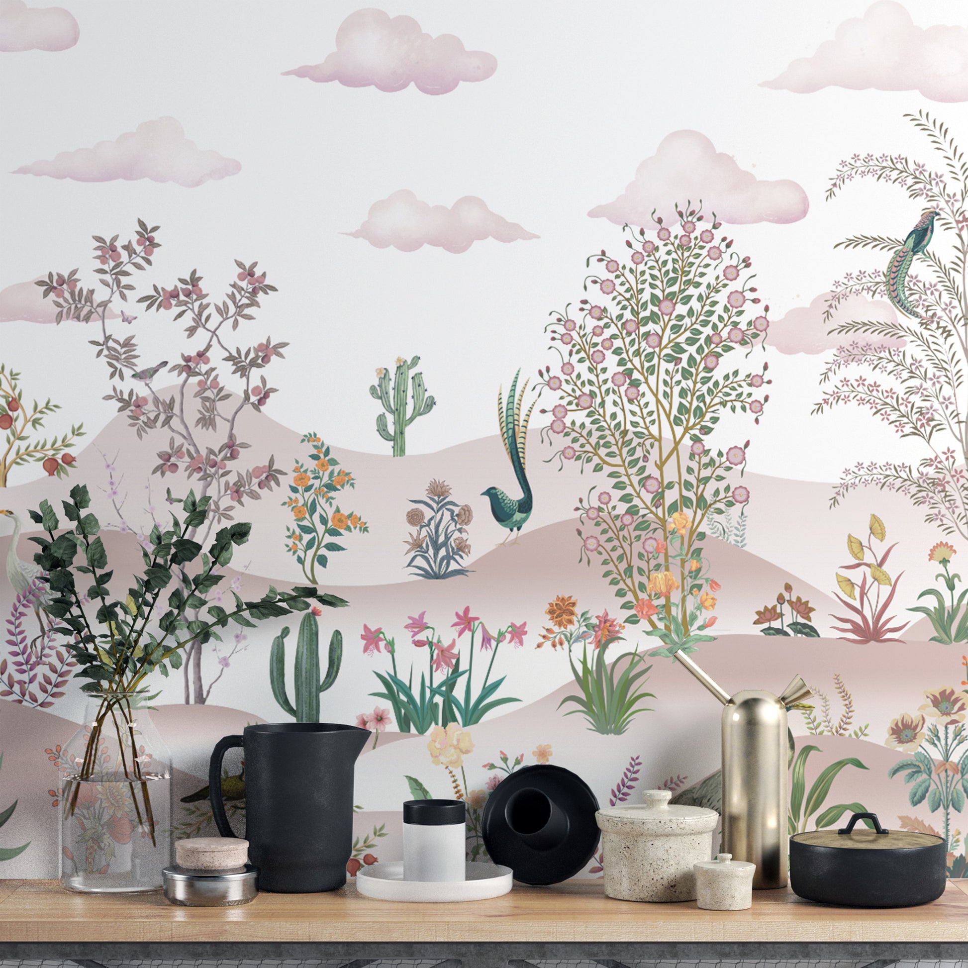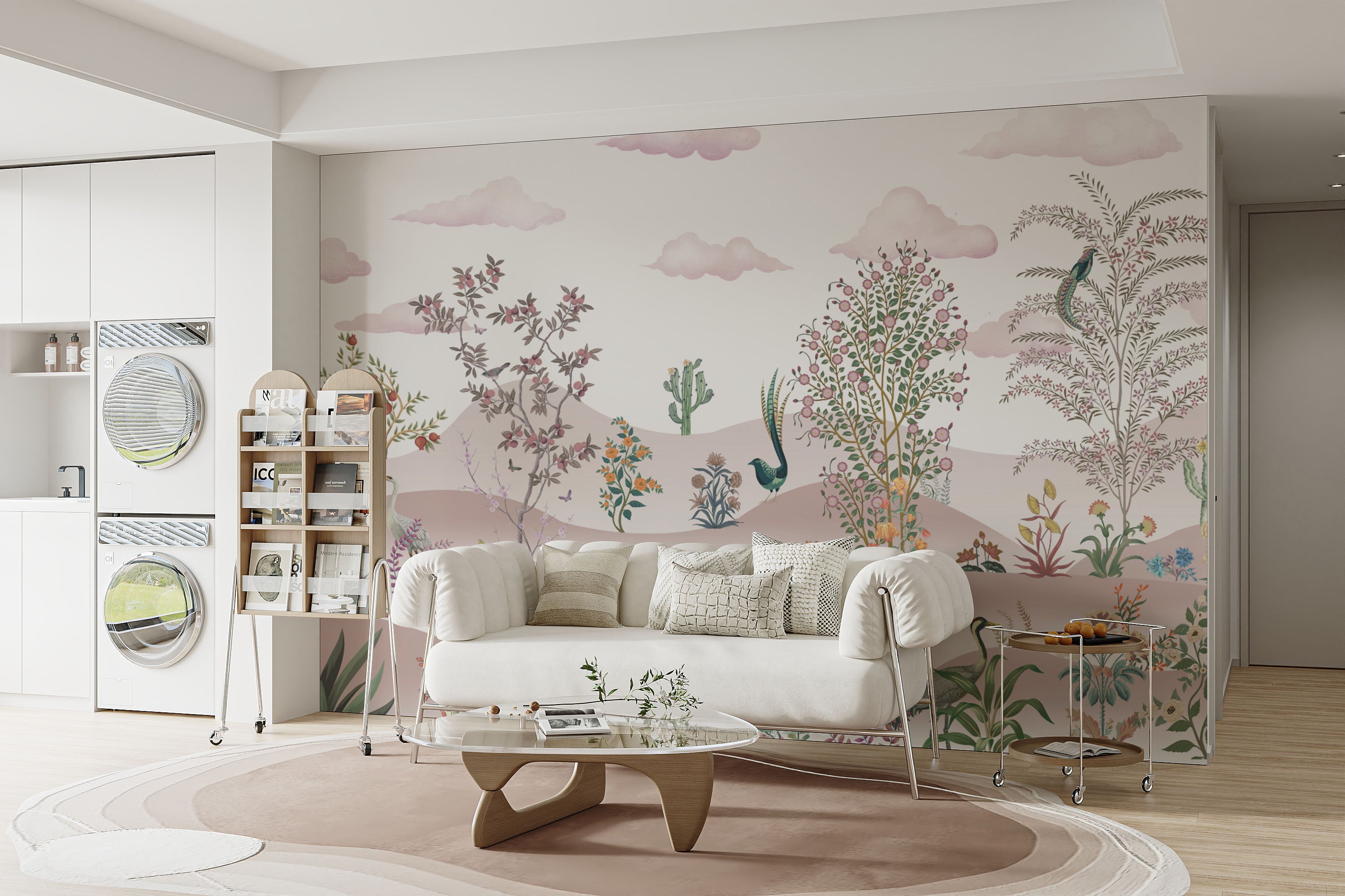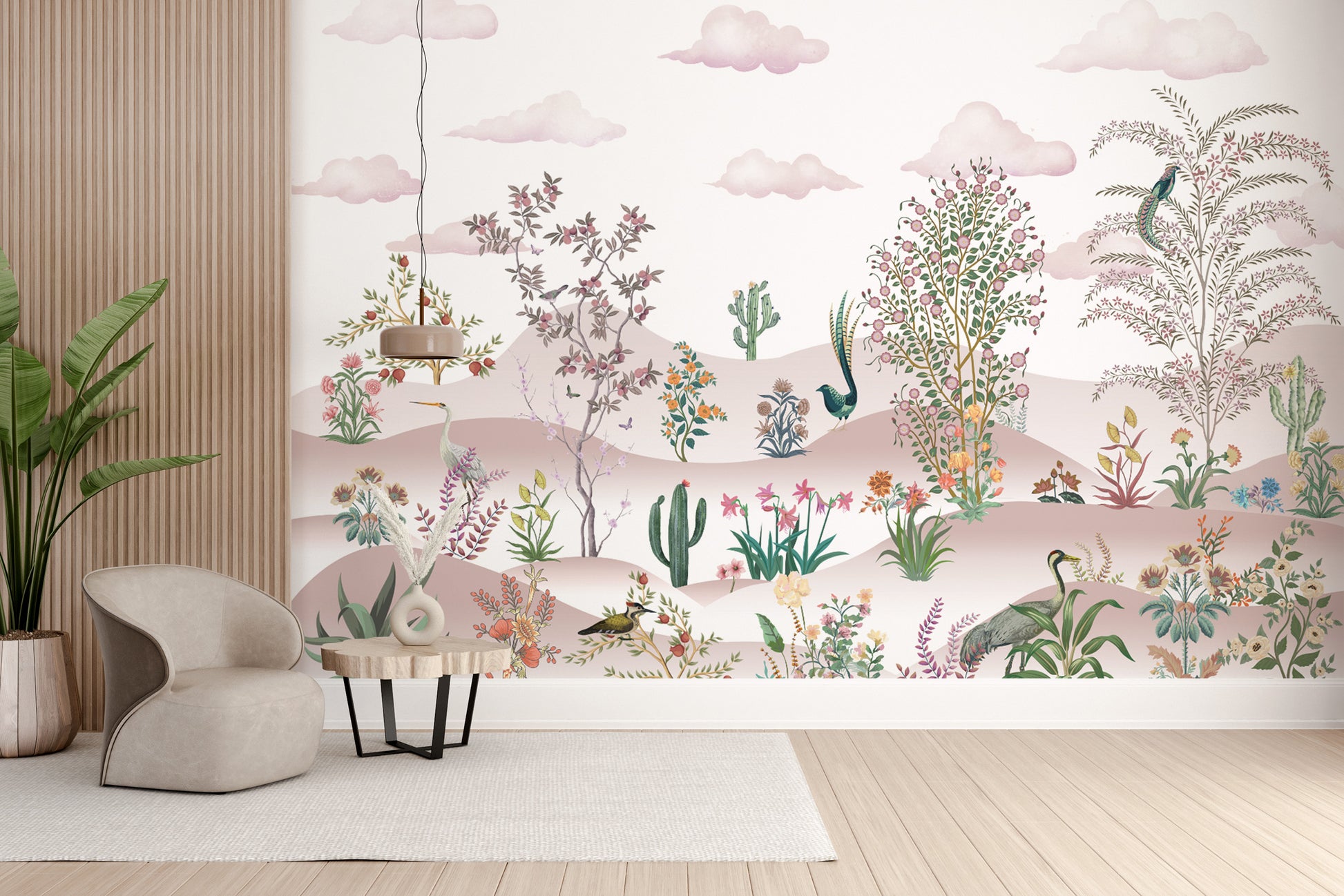 Vintage desert botanical wallpaper mural brings a serene landscape to any room with soft pastel dunes, delicate florals, and exotic birds. The hand-painted watercolor style enhances the beauty of desert flora, including cacti and flowering trees. Elegant peacocks and herons add a touch of nature's charm, creating a peaceful setting. The muted earthy tones blend well with modern and classic interiors. This desert botanical wallpaper suits living rooms, bedrooms, and offices, offering a timeless appeal. The intricate details of floral and fauna wallpaper provide a sophisticated look. Perfect for those who appreciate nature-inspired designs with vintage charm.