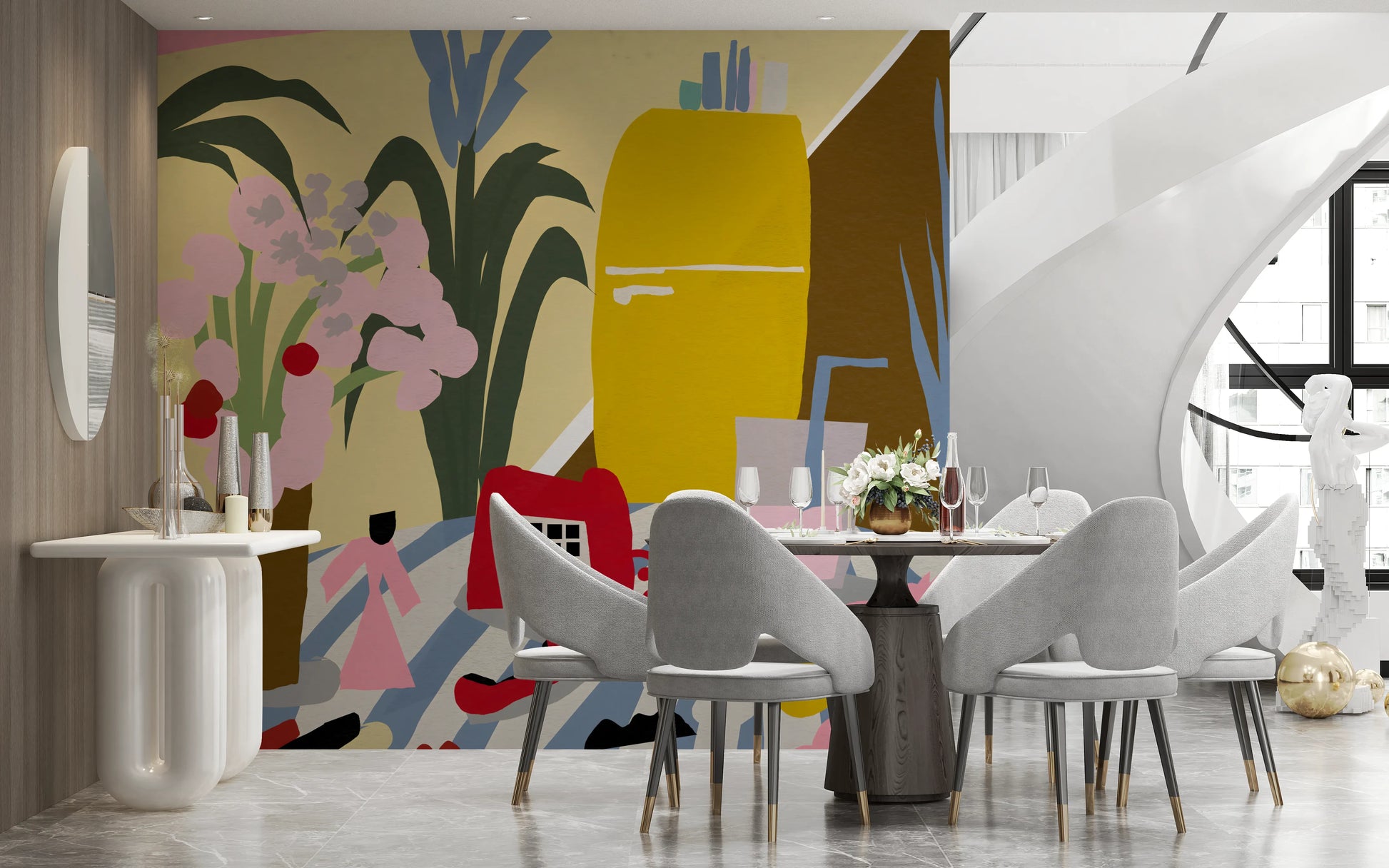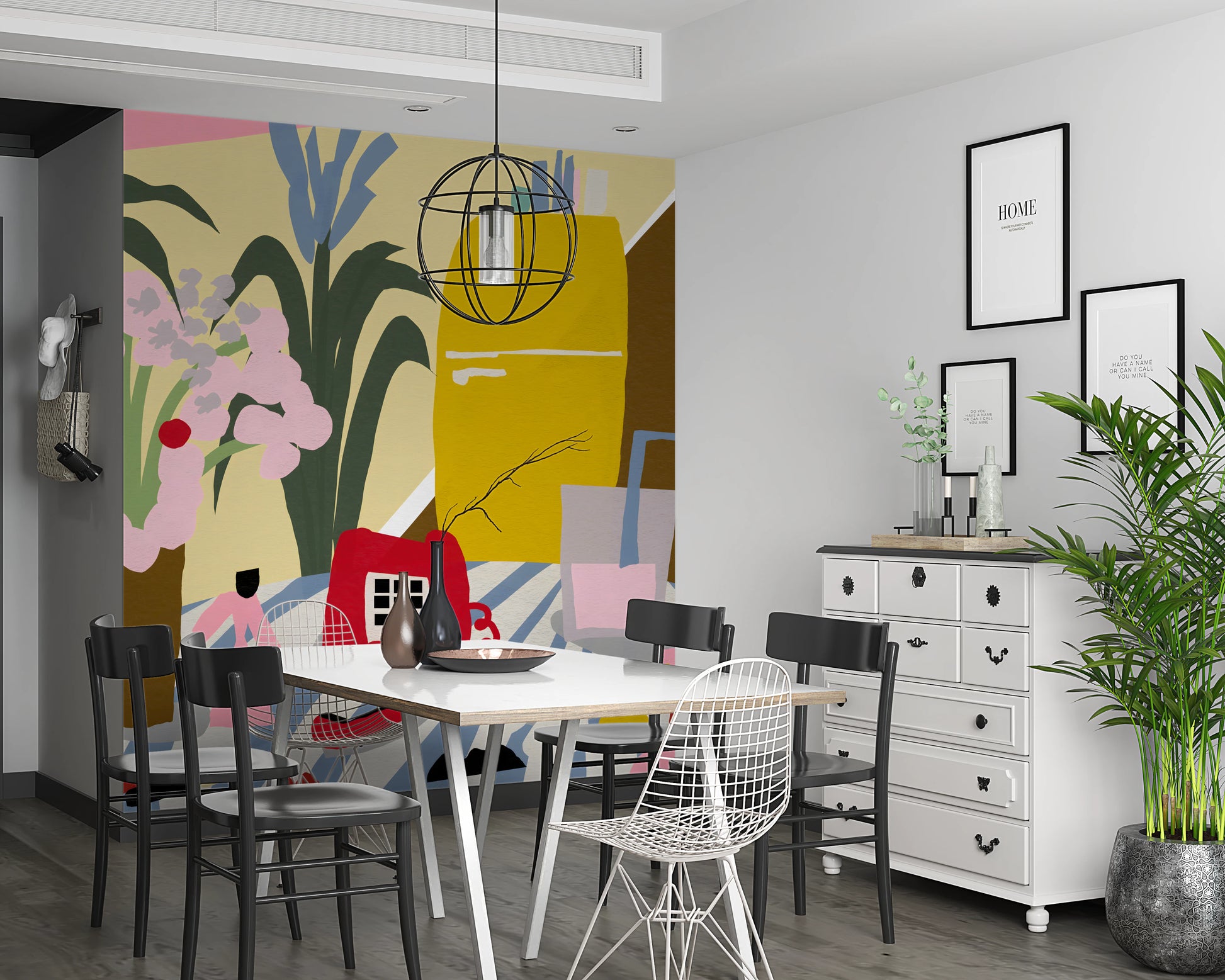 Step back in time with this captivating "Vintage Mid-Century Kitchen Still Life" wall décor. This artwork celebrates the iconic design sensibilities of the era, depicting a stylized kitchen scene filled with retro charm. A sunshine-yellow refrigerator stands tall, while a classic red rotary phone and a refreshing glass of pastel pink drink sits invitingly nearby. Bold, graphic floral arrangements add a touch of natural beauty to the scene, all set upon a striped tablecloth that exudes a sense of playful nostalgia. The color palette is pure mid-century modern, with a blend of muted and vibrant tones creating a warm and inviting atmosphere. Perfect for adding a touch of retro flair to any room, this still life brings a sense of history and style to your walls.