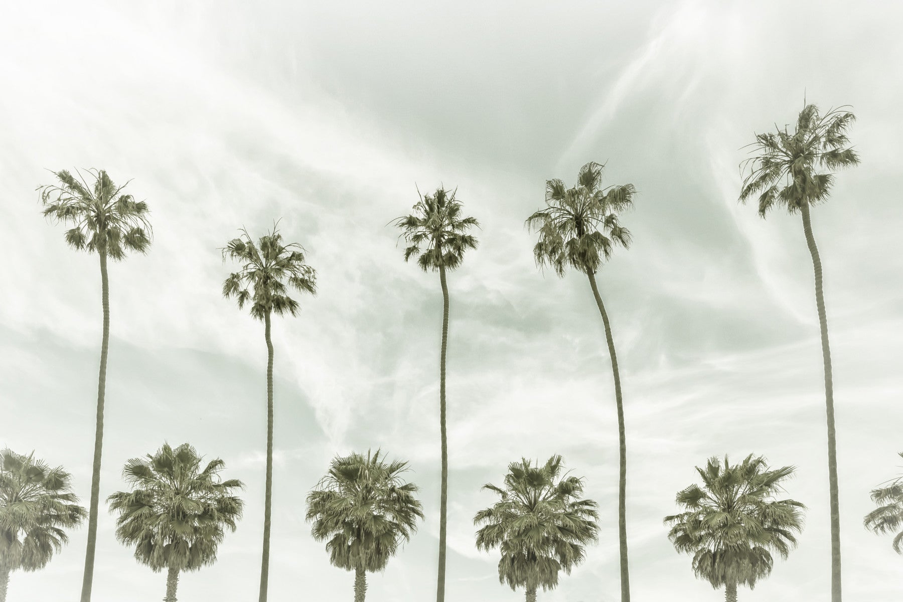 Embrace the nostalgic charm of 'Vintage Palm Trees,' a stunning wallpaper showcasing a row of elegant palm trees silhouetted against a soft, muted sky. The image evokes a sense of serene tranquility, with a timeless aesthetic. Tall, slender trunks reach towards a lovely sky, creating a visually captivating and balanced composition. This wallpaper is perfect for adding a touch of classic California cool or a hint of vintage sophistication to your space.