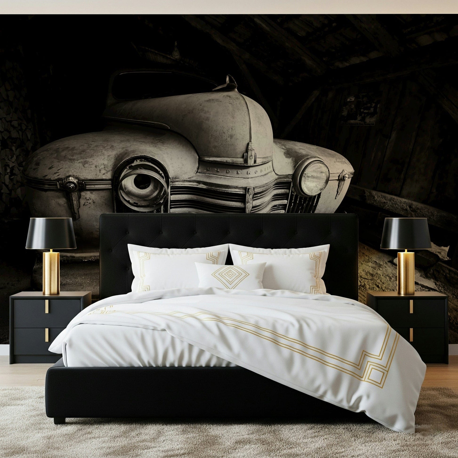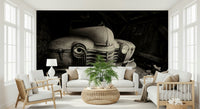 Showcase a piece of automotive history with this wallpaper. It features a 1941 Oldsmobile in a sepia tone, adding a vintage appeal. The car, with its detailed grill and weathered finish, stands out against a dimly lit backdrop. This wallpaper for walls is perfect for studies, garages, or living rooms where you want to introduce a classic, industrial vibe. The monochrome palette makes it versatile, able to complement various color schemes and interior styles. Capture a moment of time.