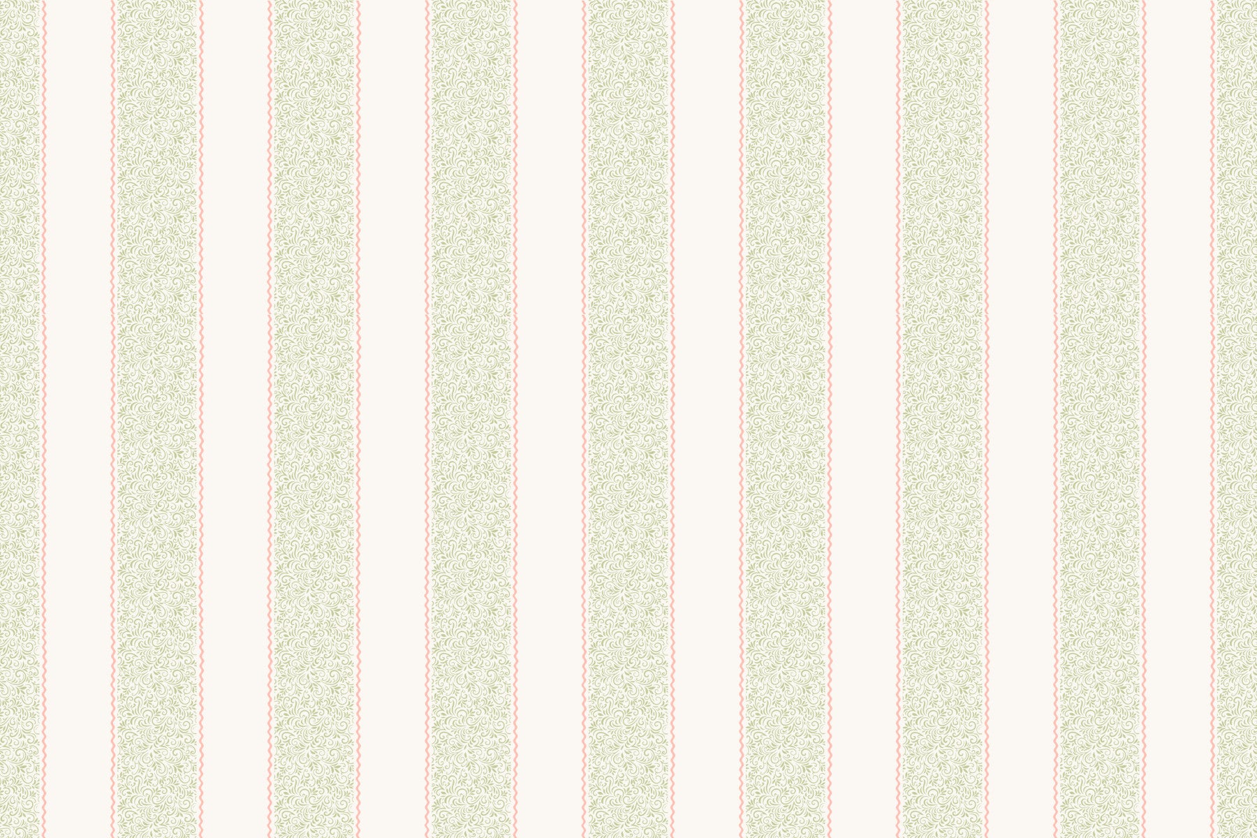 This wallpaper features a classic striped design with an intricate leaf motif in light green and soft pink. The gentle color palette and elegant pattern create a calm and inviting atmosphere. Ideal for bedrooms or living rooms, the vertical stripes can make spaces appear taller. This wallpaper for walls gives a vintage feel to any space. Its sophisticated look easily complements classic and modern interior styles, bringing a touch of quiet elegance and charm to your home.