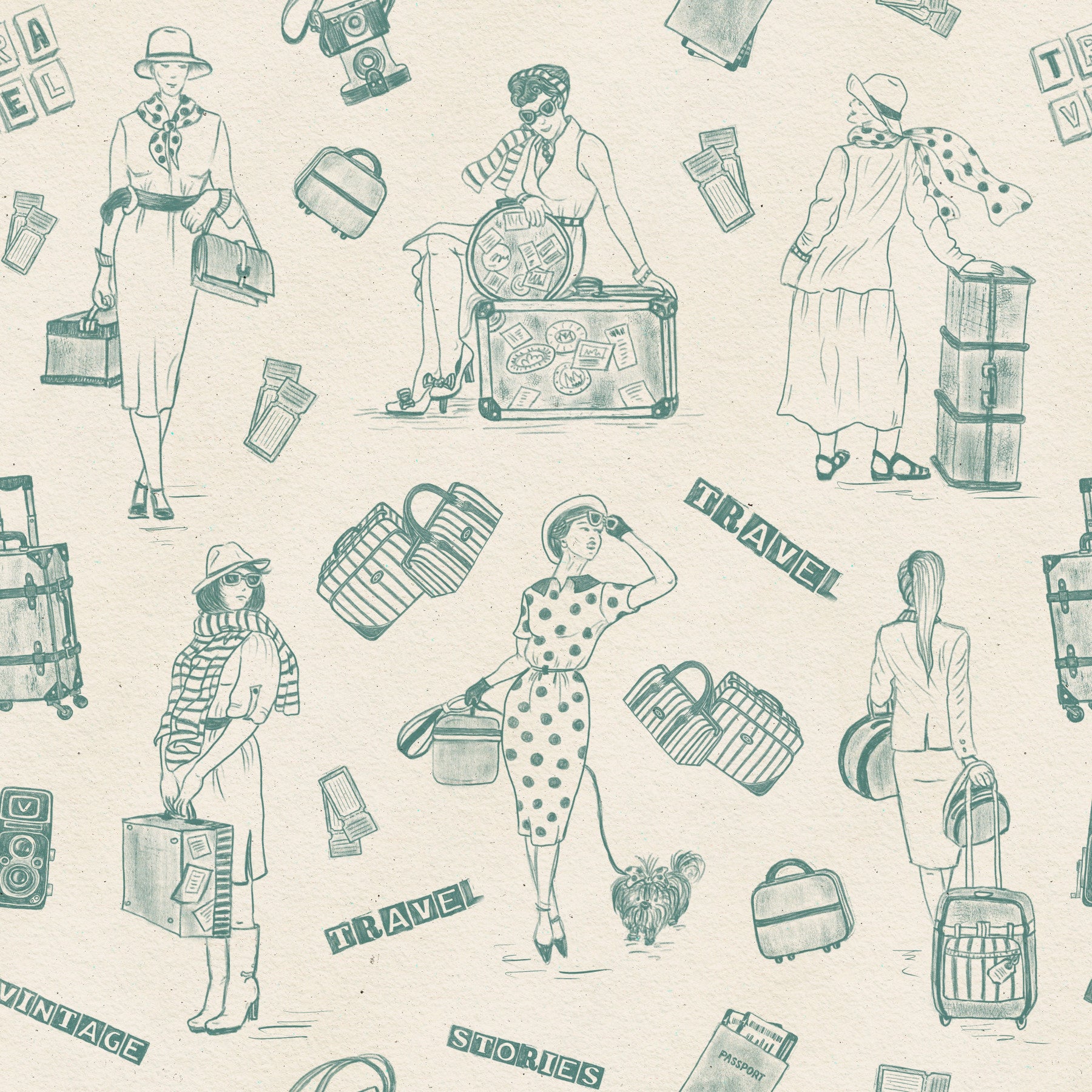 Step back in time with this delightful vintage travel-themed wallpaper for walls. The design features hand-drawn illustrations of stylish travelers, luggage, and vintage cameras, evoking a sense of wanderlust and classic elegance. The neutral background with teal accents creates a sophisticated and calm feel. Use this wallpaper in your living room, bedroom, or home office to bring a touch of retro charm and inspire your next adventure. It especially complements interiors with a classic or bohemian decor.
