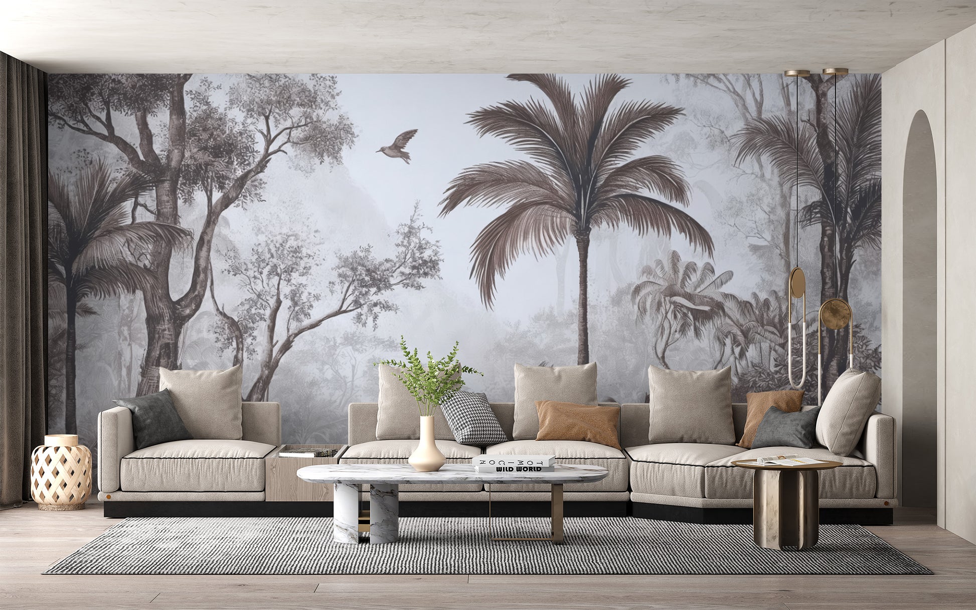 Bring nature's beauty indoors with the vintage tropical jungle mural. This design creates a peaceful setting with lush palm trees, misty rainforest details, and a hand-drawn aesthetic. The monochrome botanical wallpaper blends effortlessly with various interiors, making it perfect for bedrooms, living rooms, or offices. The sepia jungle wall art offers a timeless appeal, adding depth and elegance to walls. Crafted with high-quality materials, this tropical paradise mural enhances any space with its exotic charm. Perfect for those who appreciate nature-inspired wall coverings, this tropical jungle wallpaper brings the serenity of the rainforest into everyday life.