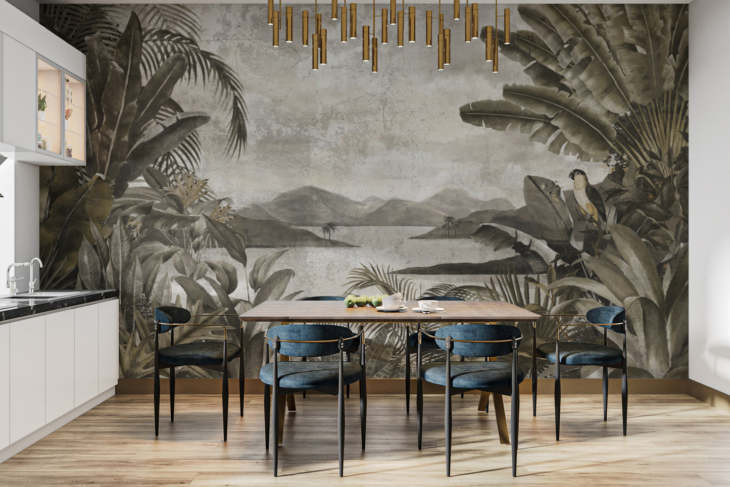 Give your room a transformation with the vintage tropical jungle wallpaper mural, a beautiful combination of botanical paradise wallpaper with a heavy dose of luxury tropical wallpaper. Decorated with a variety of prominent, lush vegetation, banana leaves, and exotic rainforest mural aspects, this work shows the elegance of nature in a monochrome, tropical wallpaper design. The calm ambiance, with the misty mountains and exotic birds, gives the space a sense of sophisticated appeal. Very good for living, bedroom, or office, this hand-decorated jungle mural adjoins the interiors with a classic simplicity. Succumb to the charm of nature with this antique botanical wall painting, and instead, enjoy a serene space in your house.