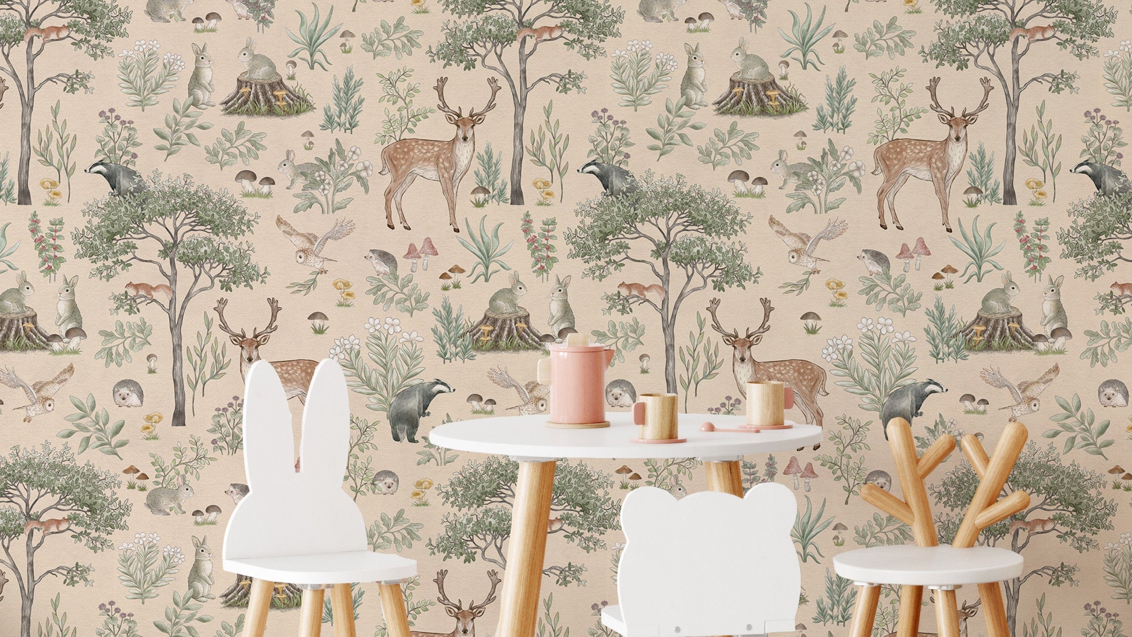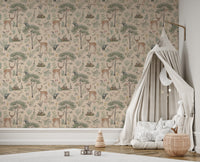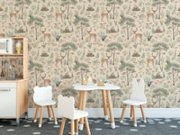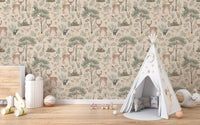 Bring a soothing wildlife charm to your space with this warm beige wildlife wallpaper. Featuring delicate hand-drawn deer, lush trees, and woodland creatures, this design offers a serene outdoor feel. The soft beige wallpaper base blends seamlessly with nature-inspired tones, creating a balanced and calming ambiance. Ideal for bedrooms, nurseries, or reading nooks, this wallpaper pairs beautifully with wooden furniture and earthy decor. Whether you love rustic charm or want a subtle nature-inspired aesthetic, this pattern brings warmth and character to any room. The intricate details of flora and fauna make every glance a delightful experience, perfect for those who appreciate a timeless, cozy atmosphere.