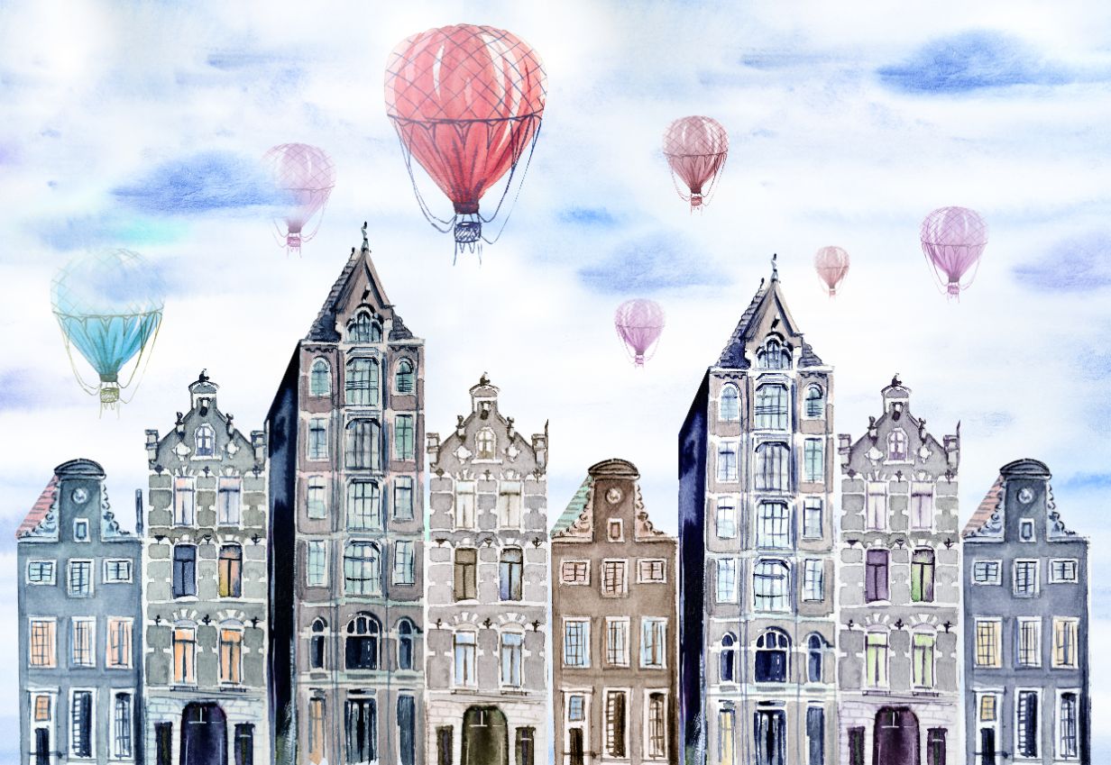 Hot air balloons over Amsterdam skyline wallpaper mural