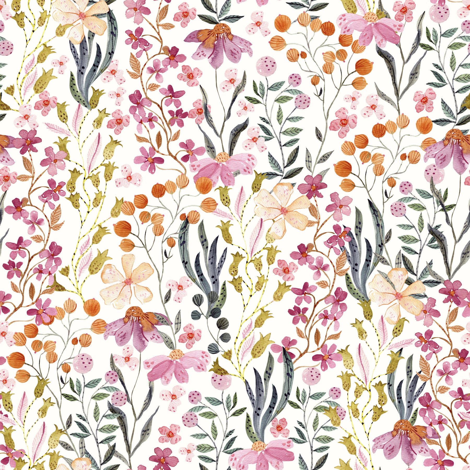 This wallpaper showcases a delightful watercolor floral pattern, featuring a whimsical array of blossoms in soft pink, peach, and orange hues. Delicate leaves in muted greens and grays intertwine with the flowers, creating a sense of gentle movement and tranquility. The design is reminiscent of a secret garden, inviting the viewer to wander through its enchanting details. The soft color palette and hand-painted aesthetic provide a calming and serene atmosphere, perfect for bedrooms, living rooms, or any space seeking a touch of whimsical elegance. The seamless pattern ensures a cohesive and visually pleasing aesthetic across any surface.