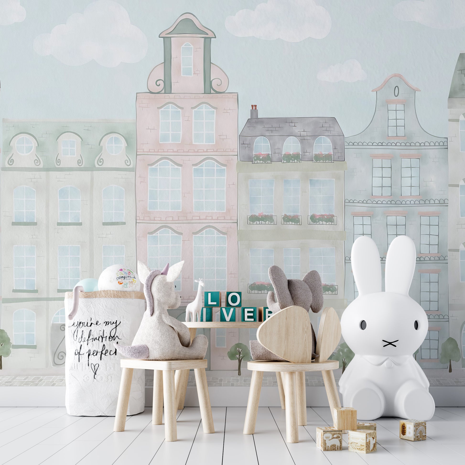 Drift away into a gentle cityscape with the watercolor city scene wallpaper and wall mural. Immerse in the whimsical charm of pastel-hued buildings and soft, cottony clouds that seem to whisper stories of a peaceful urban retreat. Each brushstroke of this watercolor cityscape wallpaper invites a unique blend of serenity and playfulness, painting an airy backdrop that cradles the imagination. As the light dances across its delicate surface, witness a living masterpiece that quietly enlivens any room. Perfect for those seeking a touch of artistic flair, this urban landscape wall mural is a symphony of color that captures the heart and soothes the soul. Let the watercolor artistic cityscape decor become the centrepiece of your personal haven.