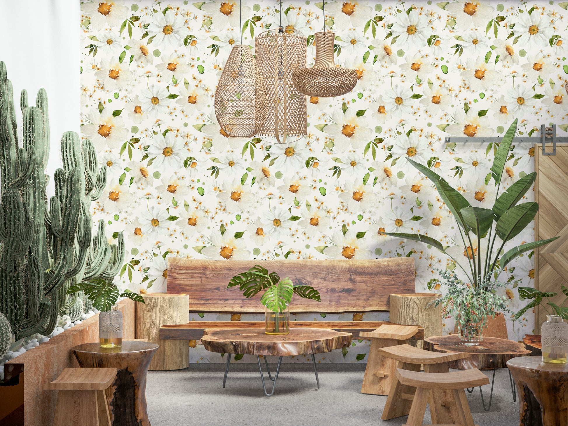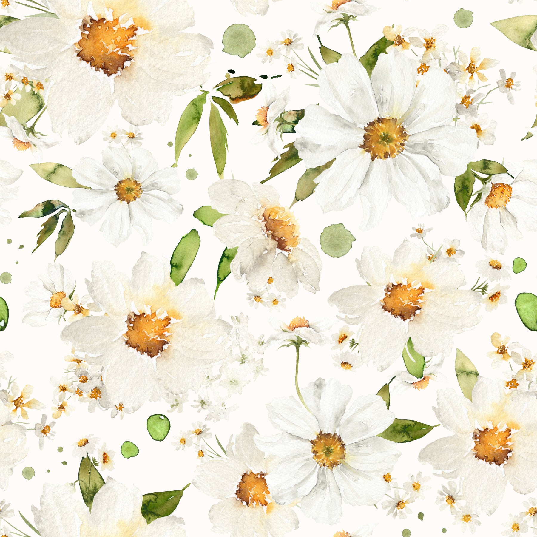 Elevate your home with this dreamy white daisy wallpaper by Uta Naumann. The watercolor design presents a continuous spread of daisies with scattered green leaves, lending a light and airy feel to any room. It is especially suited as wallpaper for walls in bedrooms, living spaces, or hallways, where its gentle pattern creates a welcoming and tranquil ambiance. The soft, neutral tones make it easy to pair with a variety of furniture styles and color schemes. Its watercolor effect gives it an artistic, hand-painted quality, enhancing the character of your interior spaces.