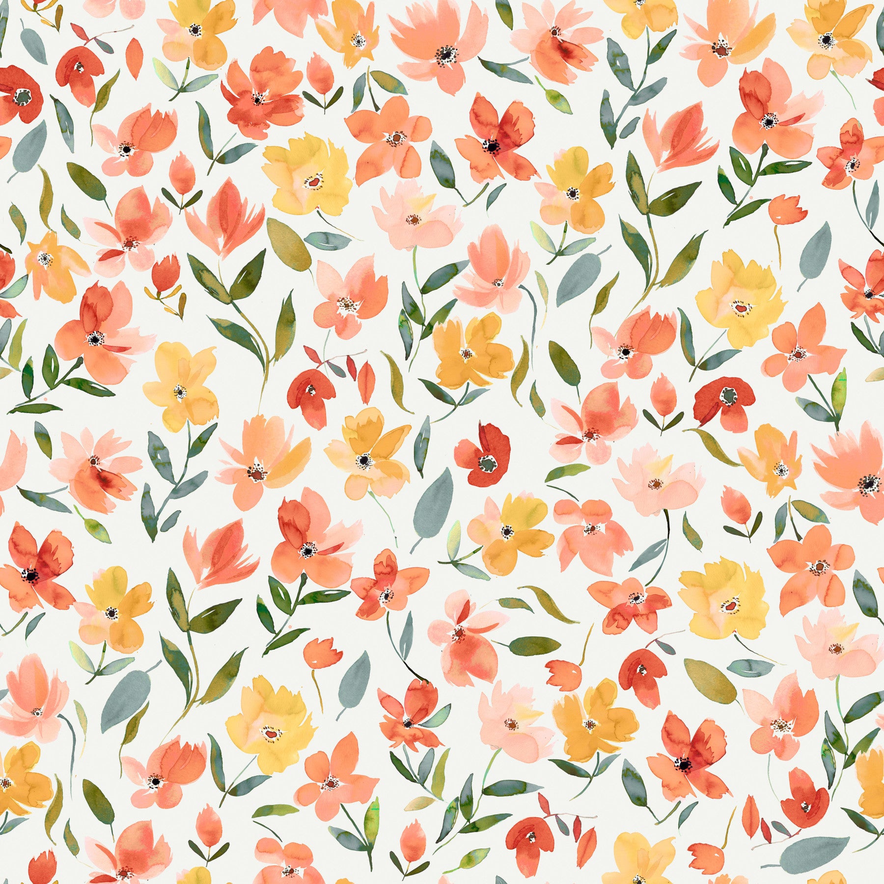 Embrace the warmth of spring with this vibrant watercolor wallpaper. A delightful array of orange and yellow flowers, rendered in a loose, painterly style, dances across a soft white background. The delicate hues and slightly abstract forms create a feeling of effortless beauty and freshness. Subtle green leaves add a touch of natural elegance, perfectly complementing the cheerful color palette. This design is ideal for bringing a cheerful and optimistic atmosphere to your digital devices, creating a calming yet energizing visual experience.
