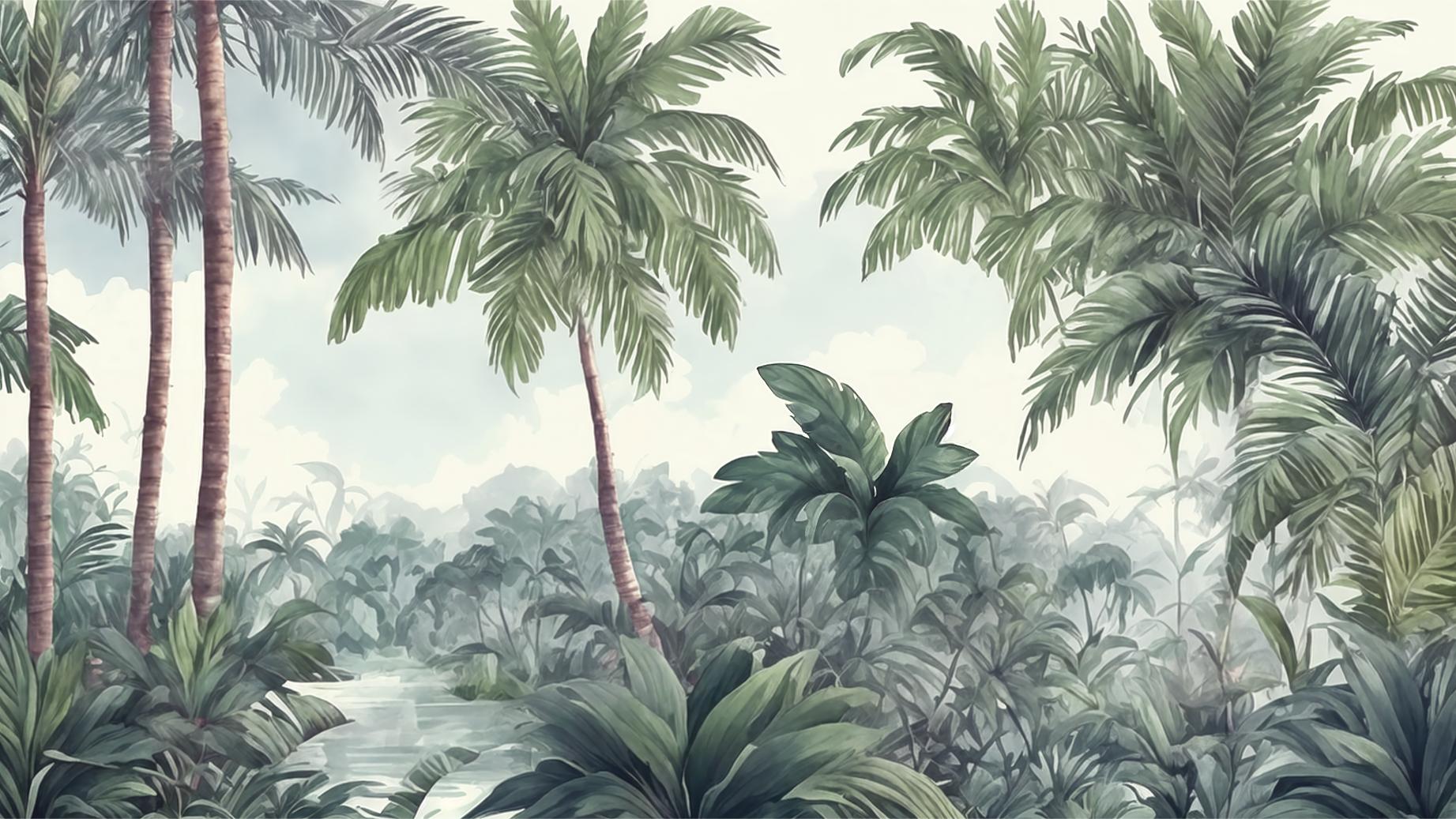 Introducing Chloro-Fill, our watercolor green trees wallpaper mural, an embodiment of nature's serenity in your home. This watercolor wallpaper showcases an array of tropical plants, predominantly featuring large monstera and banana leaves. Its background, a subtle light grey, serves as a canvas for the lush blend of teal and green hues that bring the leaves to life. The watercolor effect adds a dreamy, tranquil essence, enhancing the overall aesthetic.