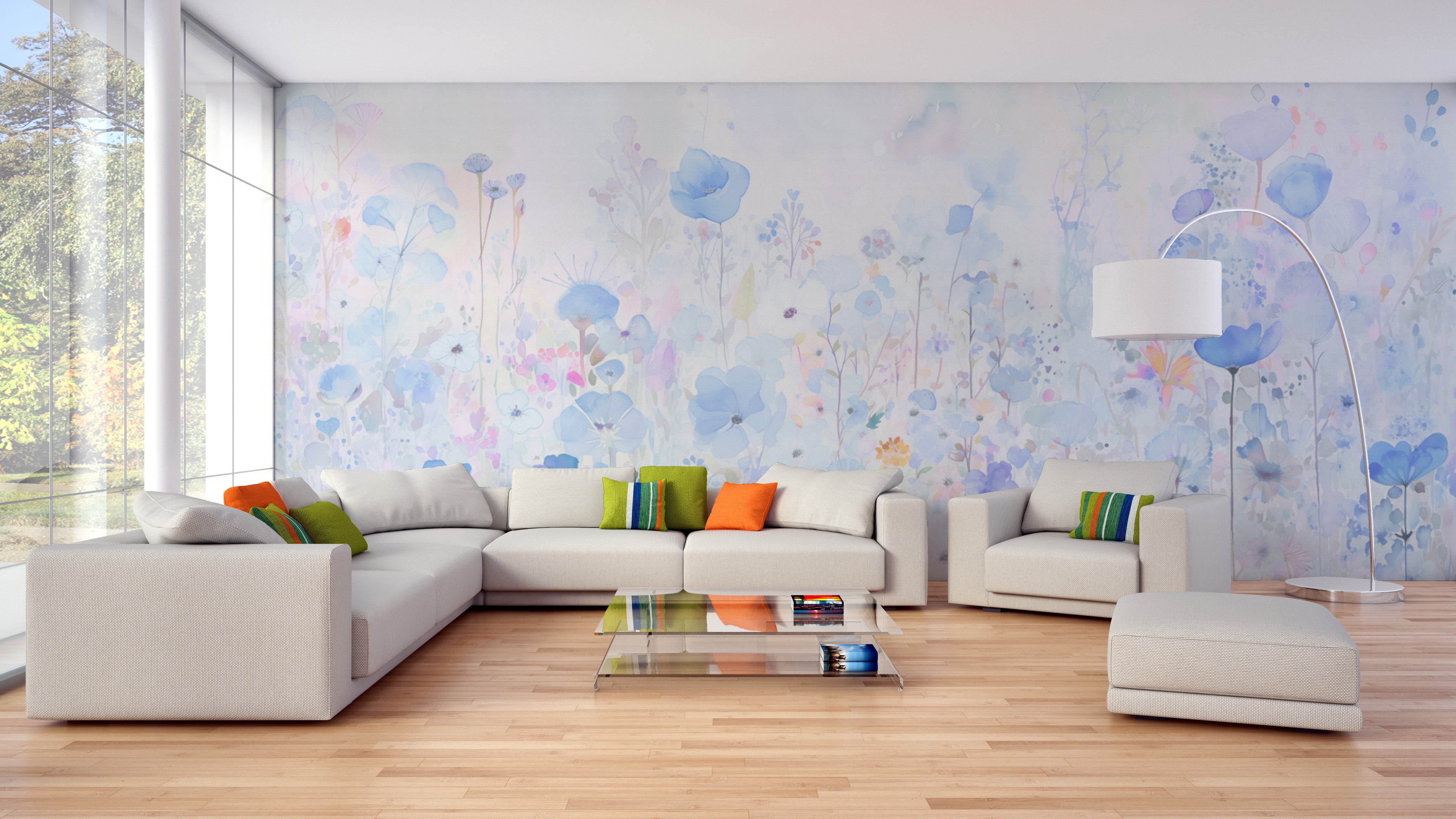 Watercolor happy flowers blue wallpaper for a cheerful, fresh room vibe.
