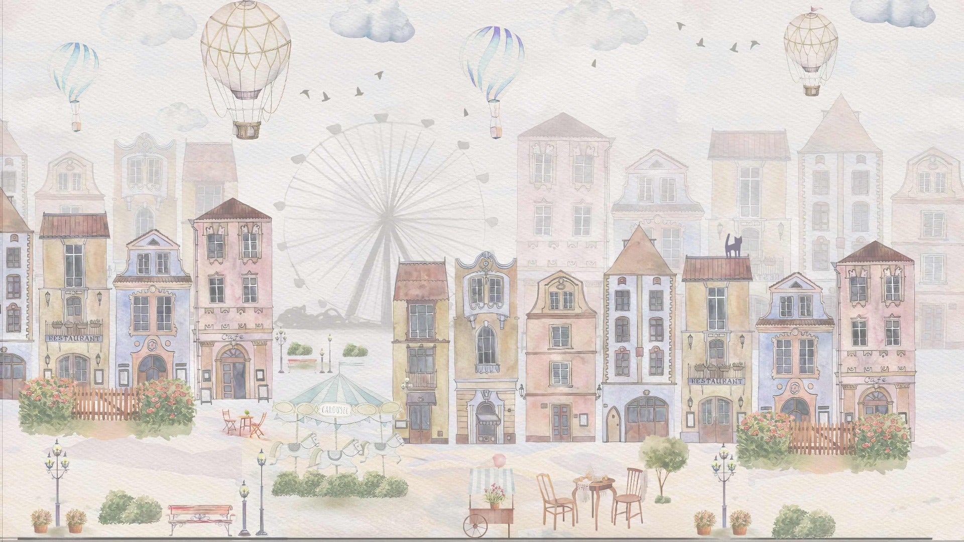 Transform your child's space with our enchanting Watercolor Old City Kids Wallpaper. These captivating kids room wallpaper features a charming old city scene, complete with whimsical buildings, hot air balloons, and a vintage carousel. The soft pastel colors and intricate details bring a sense of wonder and adventure to any room, making it perfect for inspiring your child's imagination. Easy to apply and remove, this wallpaper is ideal for nurseries, playrooms, or bedrooms. Create a magical atmosphere that your little one will love with this delightful mural, designed to spark creativity and provide a serene backdrop for their daily adventures. Perfect for enhancing any kids' room with a touch of nostalgic charm.