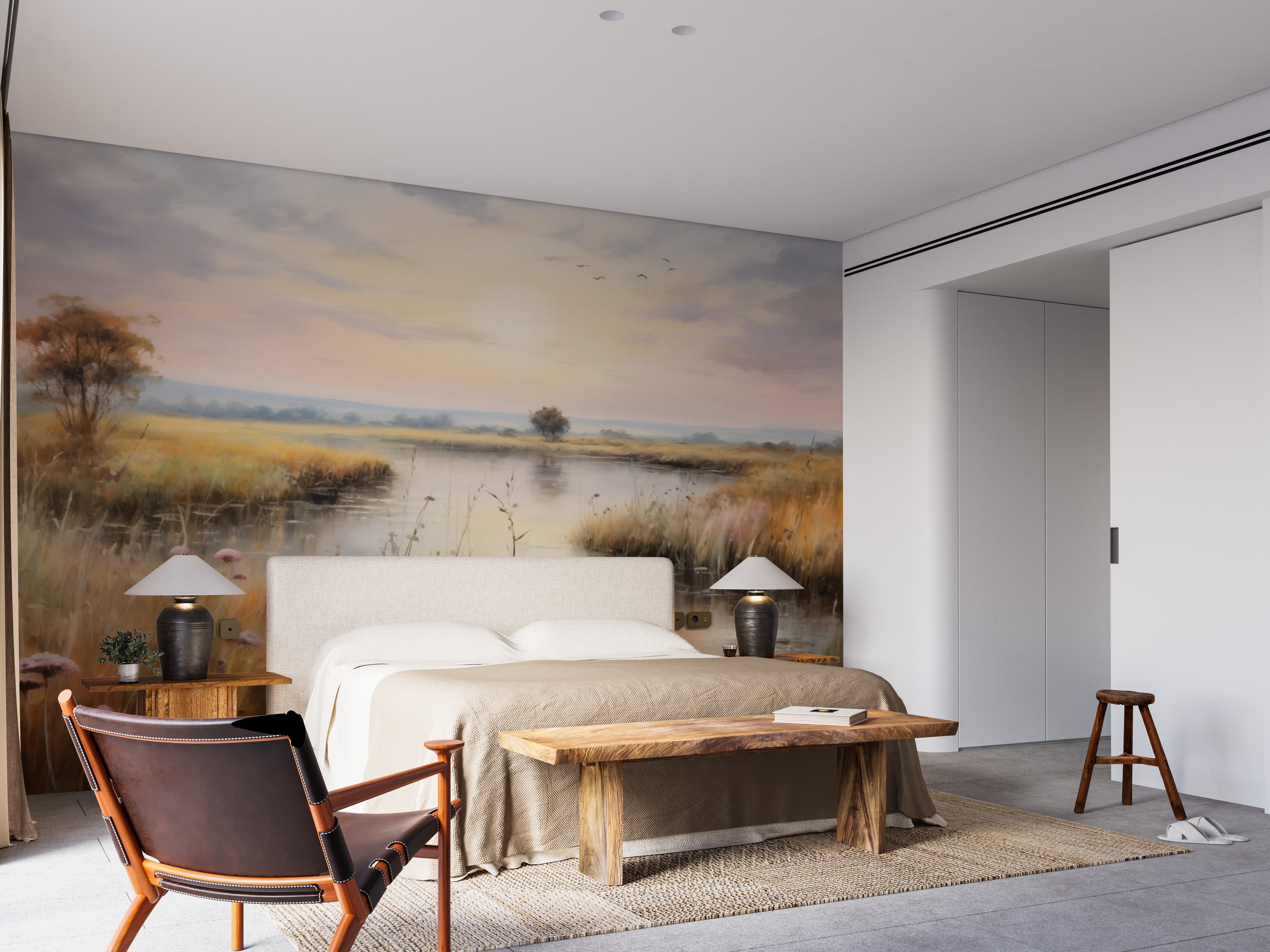 Elegant watercolor wetlands landscape lake wallpaper for a cozy, calming room.