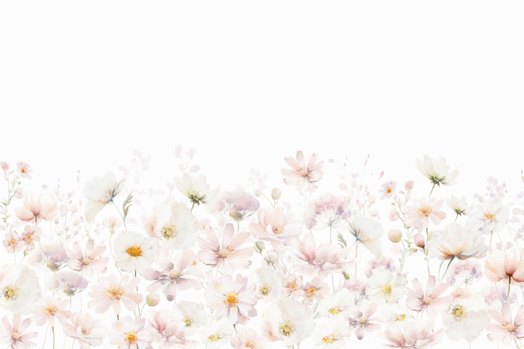 Escape to a whimsical world of wildflowers with this captivating wallpaper. Rendered in soft watercolor washes, the design features a profusion of delicate blooms in blush pinks, creamy whites, and subtle greens. The ethereal quality of the watercolor creates a dreamy, romantic ambiance, while the variety of flower types adds visual interest and depth. Perfect for adding a touch of understated elegance to a bedroom, nursery, or living room, this wallpaper is sure to transport you to a peaceful and enchanting landscape.