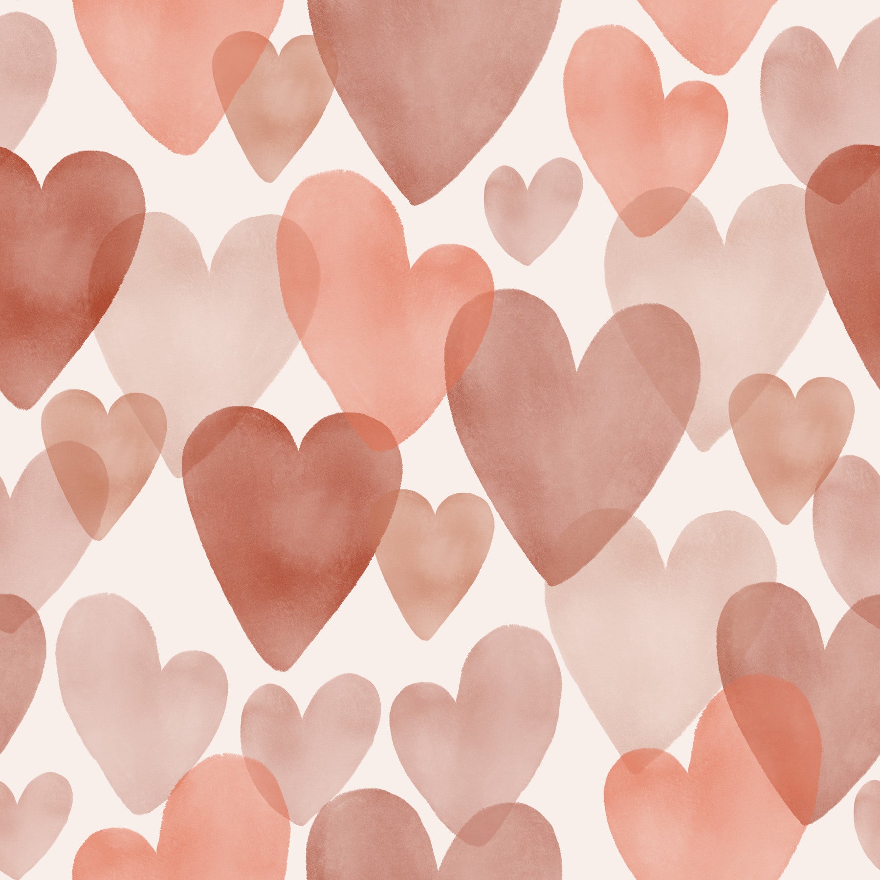 Decorative wallpaper featuring translucent watercolor hearts in peach, rose, and terracotta tones.