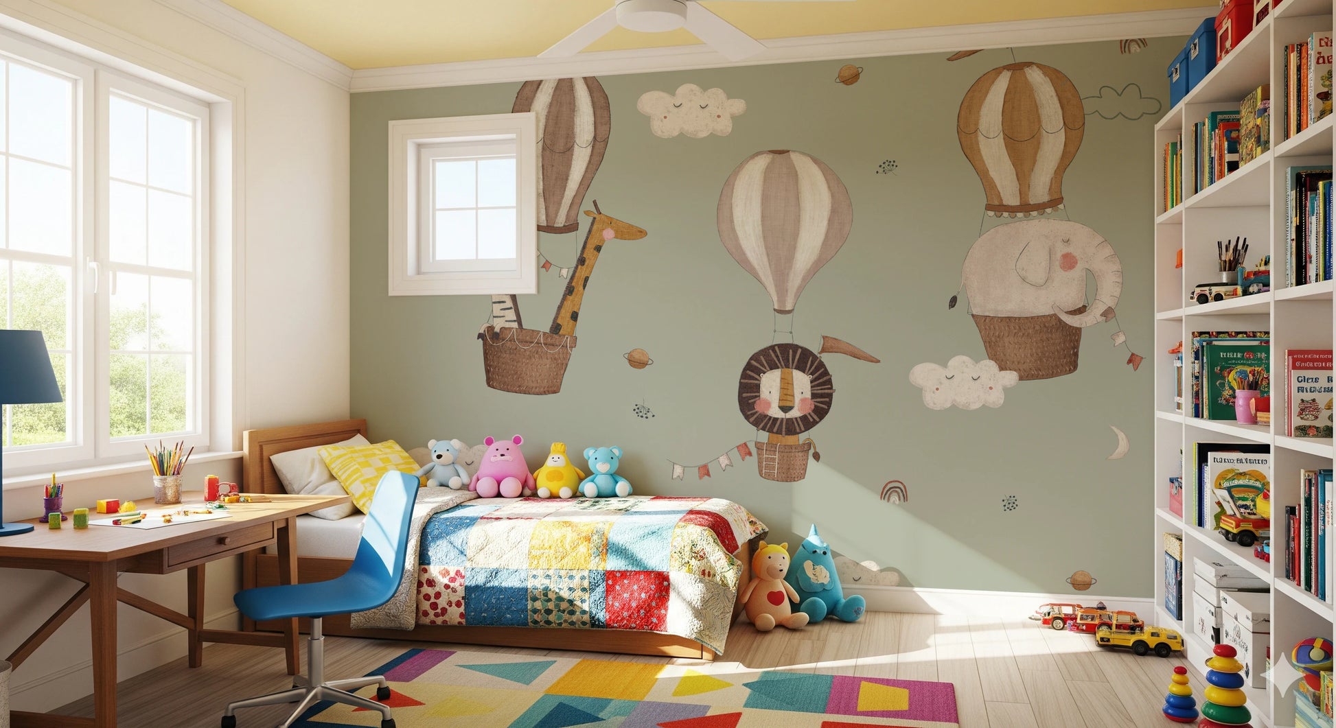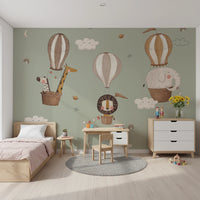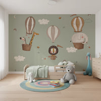 Whimsical Animal Balloon Ride Green Wall Mural