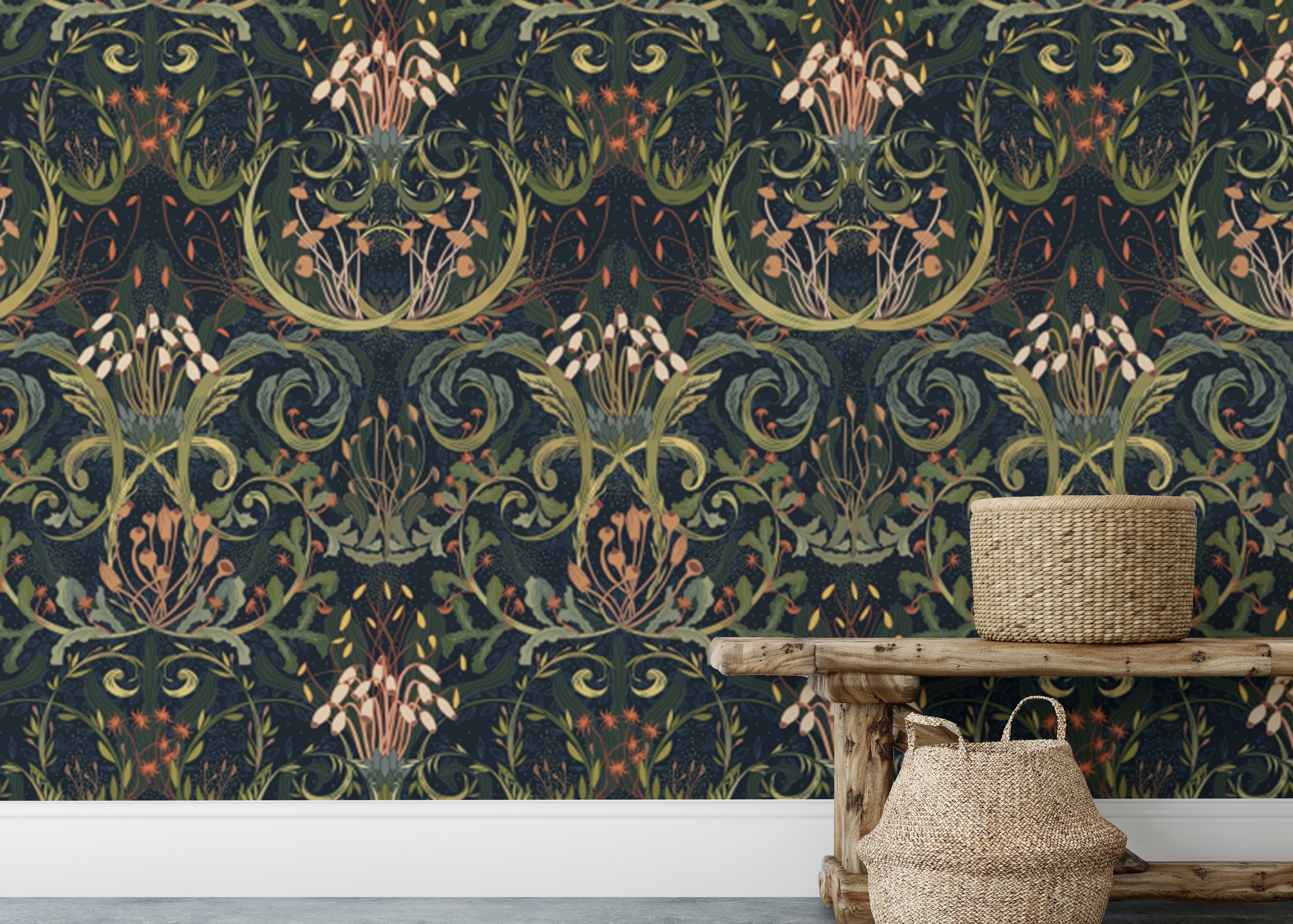 Add luxury to your space with Whimsical Botanic Silk wallpaper