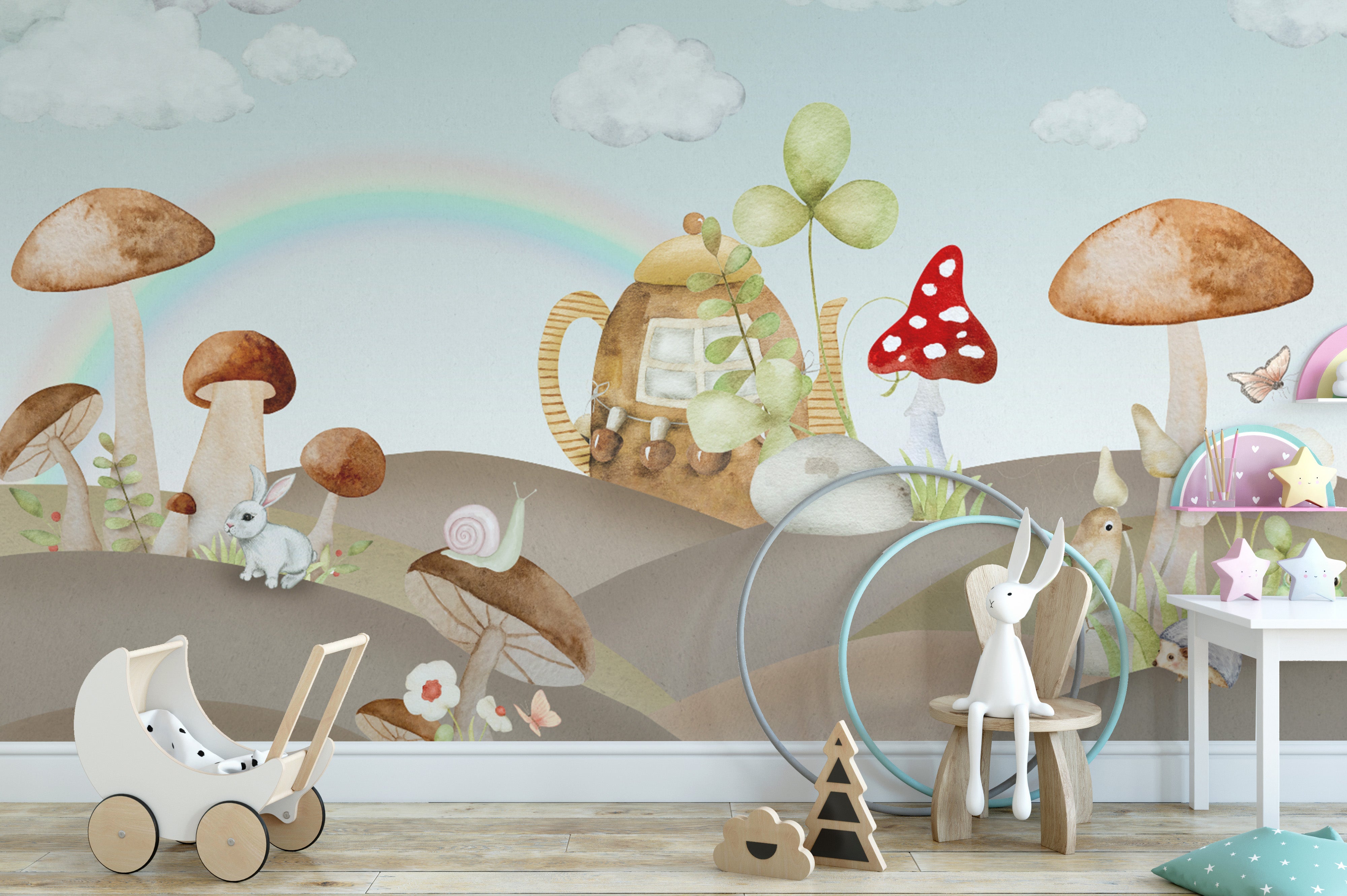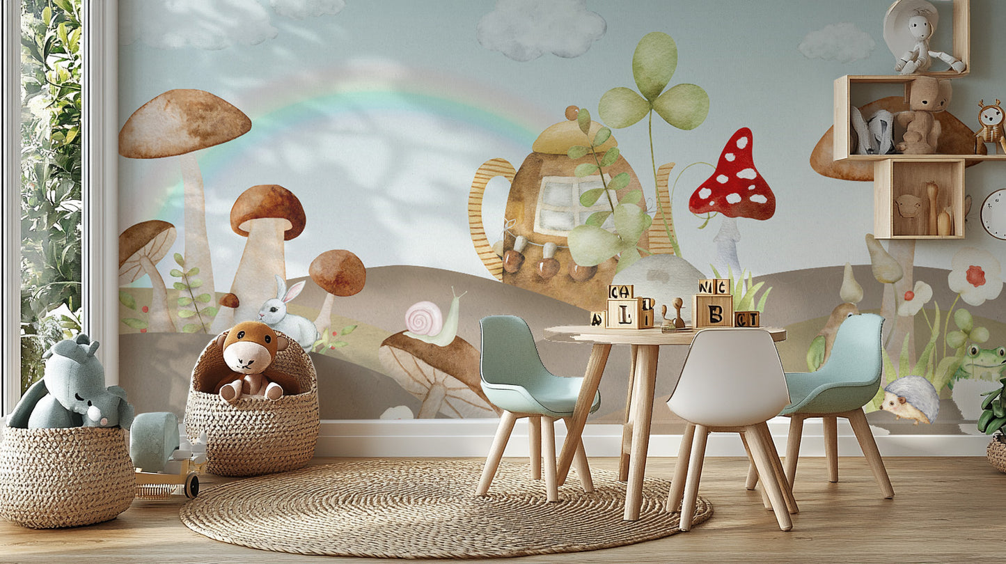 Soft hues and delicate details bring whimsical forest wallpaper to life. Towering enchanted mushroom wallpaper sets a magical scene, while woodland creatures add charm. A rustic teapot house among hills enhances the fairy tale forest wallpaper experience. Playful rabbits, birds, and hedgehogs create a lively atmosphere, perfect for kids' rooms and nurseries. The gentle rainbow and lush greenery highlight the beauty of nature-inspired nursery wallpaper. Hand-painted elements give the watercolor kids' room wallpaper a dreamlike appeal. Let the fantasy woodland wallpaper bring storytelling to walls with its enchanting scenery and delightful forest companions.