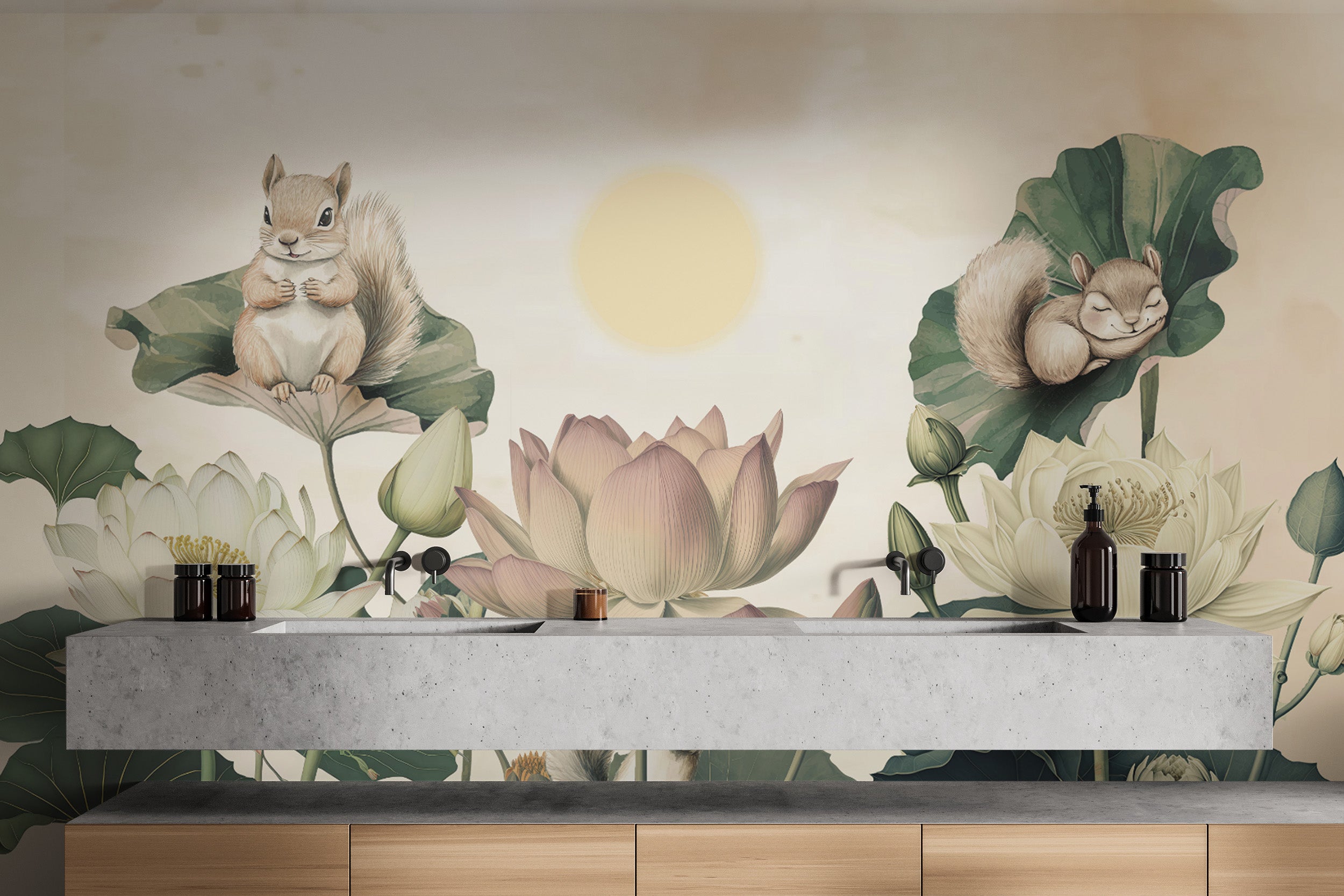 Squirrels resting among lotus blooms in nature mural