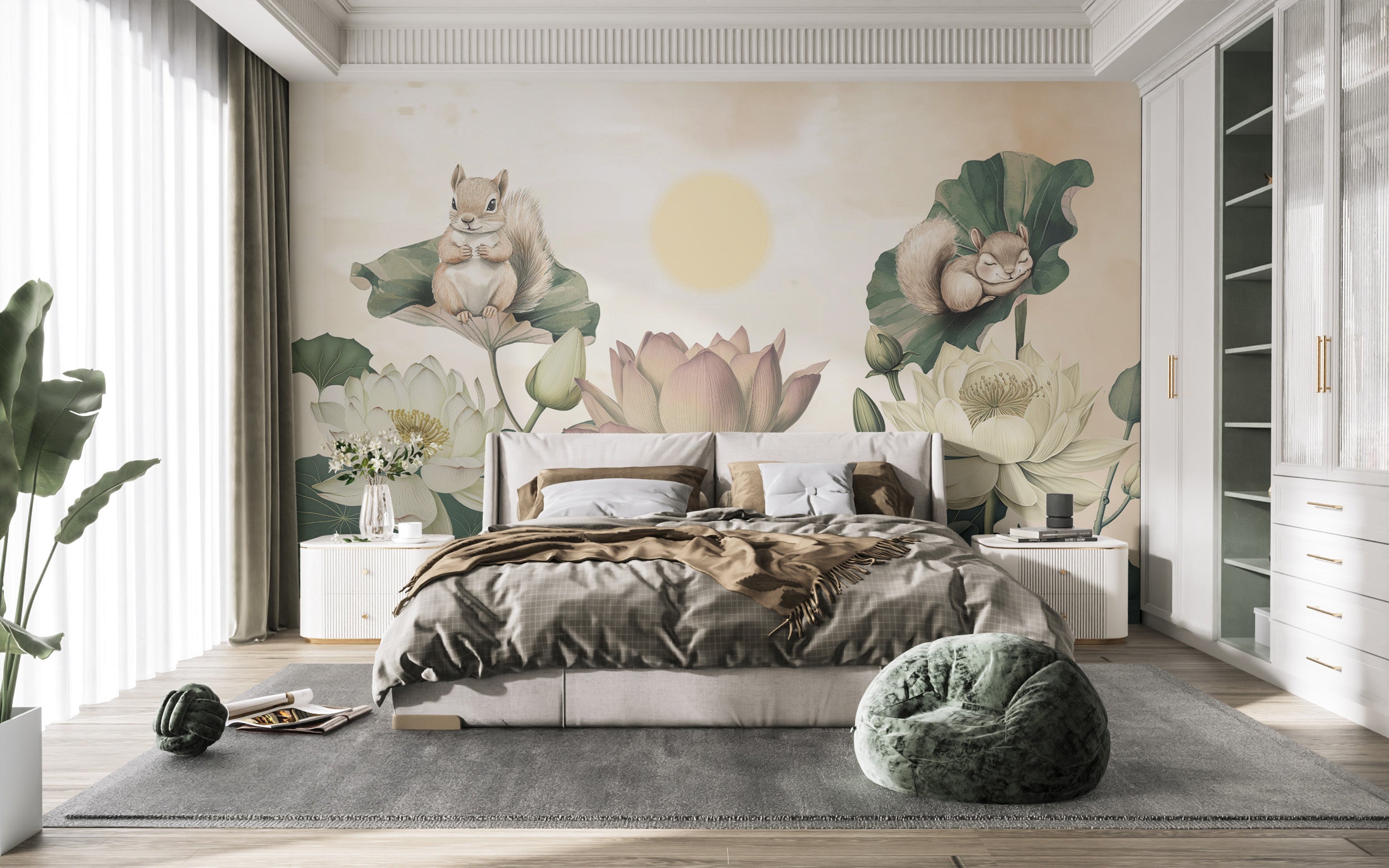 Soft pastel hues and delicate lotus blooms create a peaceful setting where playful squirrels add charm. The hand-drawn botanical details and dreamy nature-inspired scene bring warmth to any room. Gentle sunlight filters through the lush lotus leaves, enhancing the soothing effect. Ideal for bedrooms, nurseries, or relaxation spaces, this floral fantasy wallpaper blends nature's beauty with whimsical storytelling. High-quality prints ensure vibrant colours and intricate details stand out. The seamless design makes the application smooth on walls of any size. Perfect for those who appreciate enchanting nature themes and seek a refreshing change with a lotus flower wallpaper.