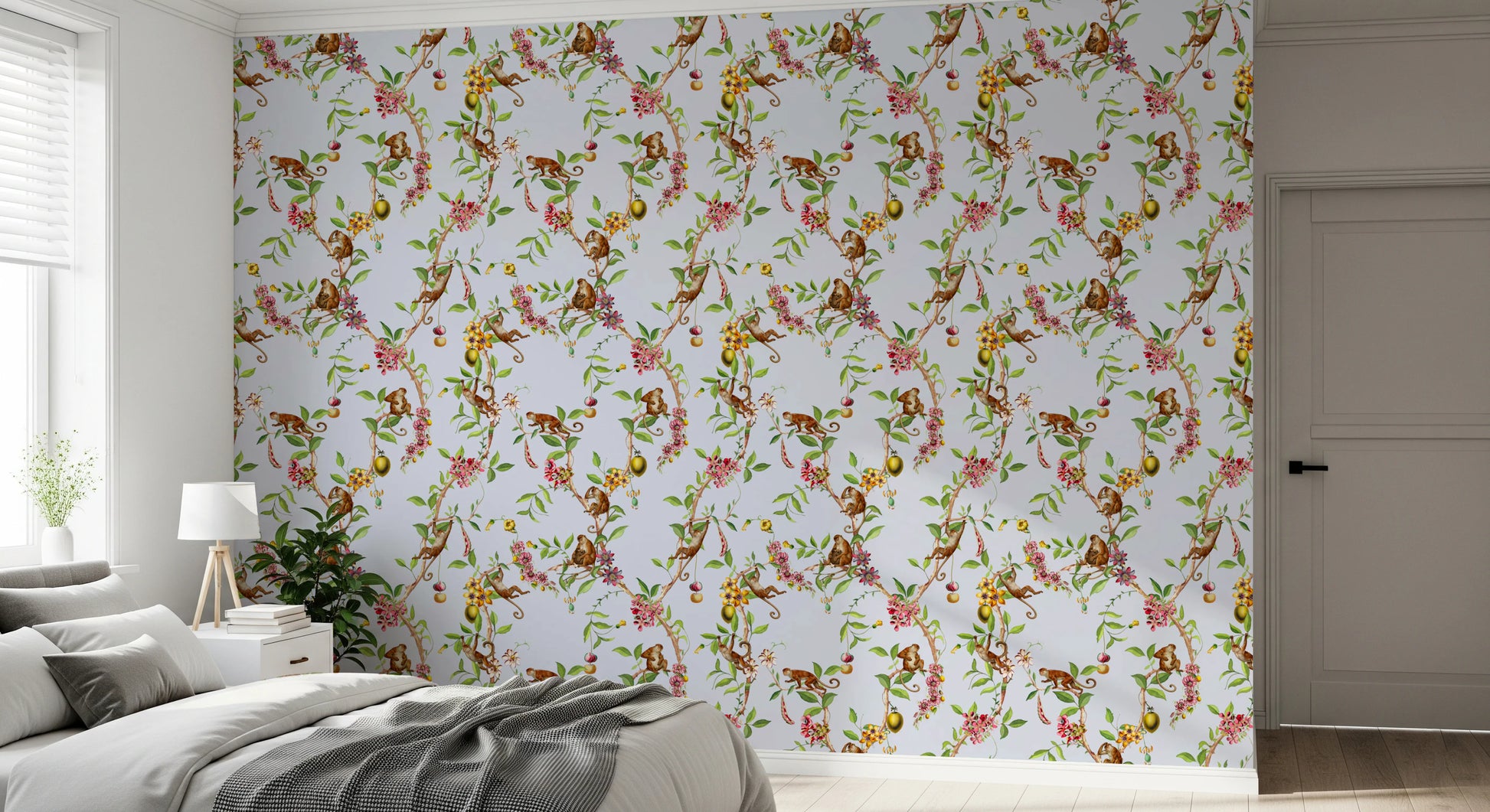 Whimsical Playing Monkeys Family Vintage Exotic Garden blue Wallpaper⁠