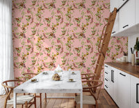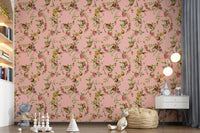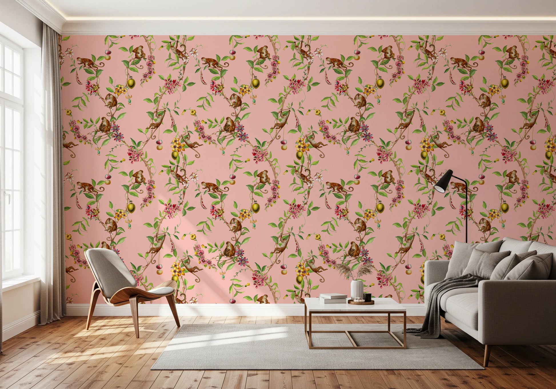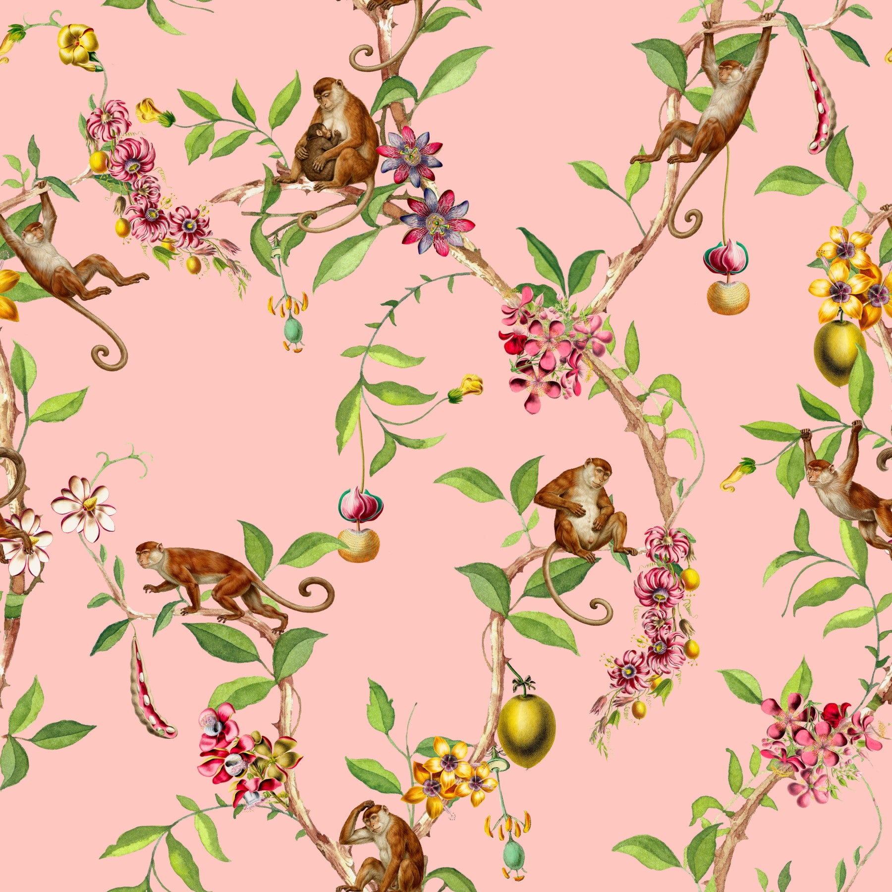 Whimsical Playing Monkeys Family Vintage Exotic Garden pink Wallpaper⁠