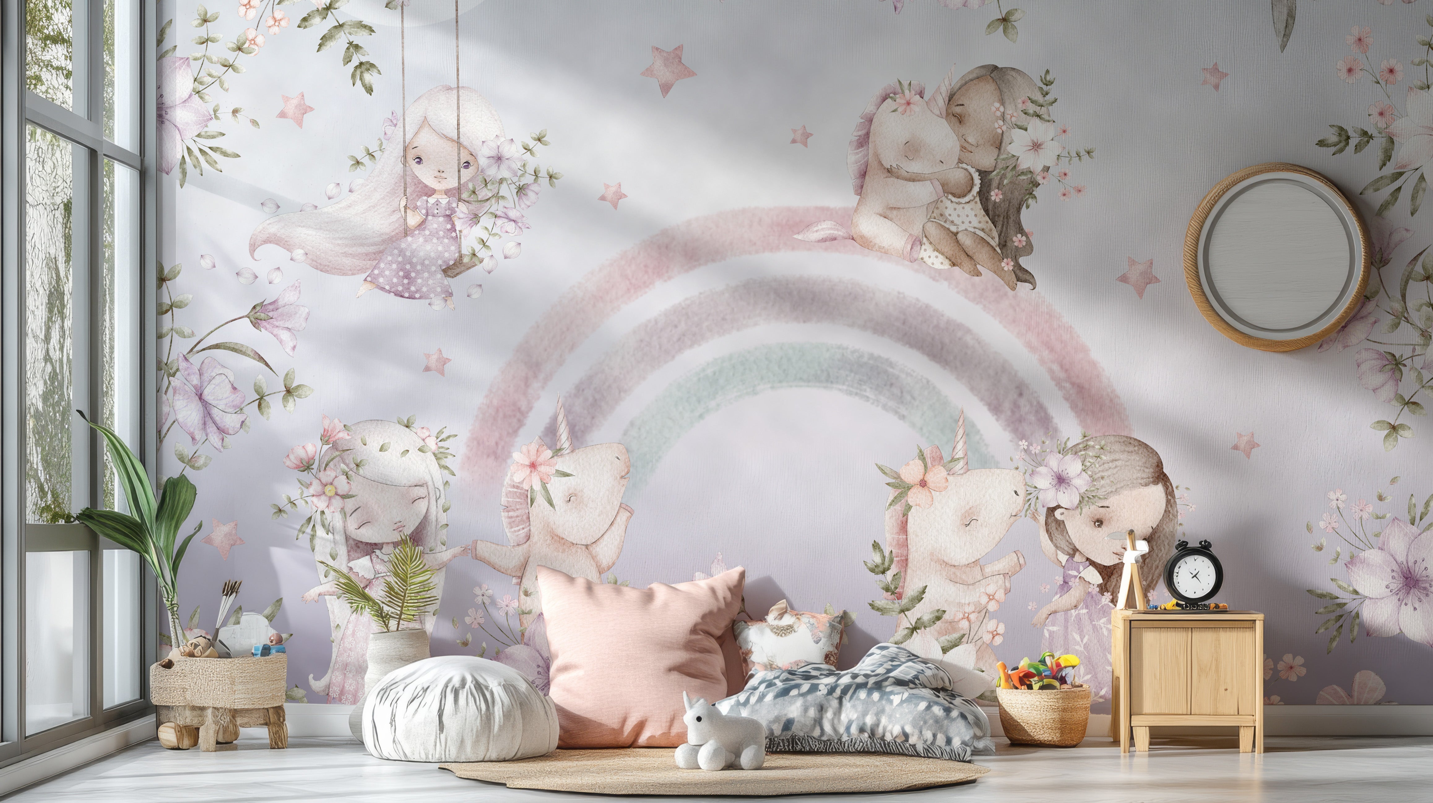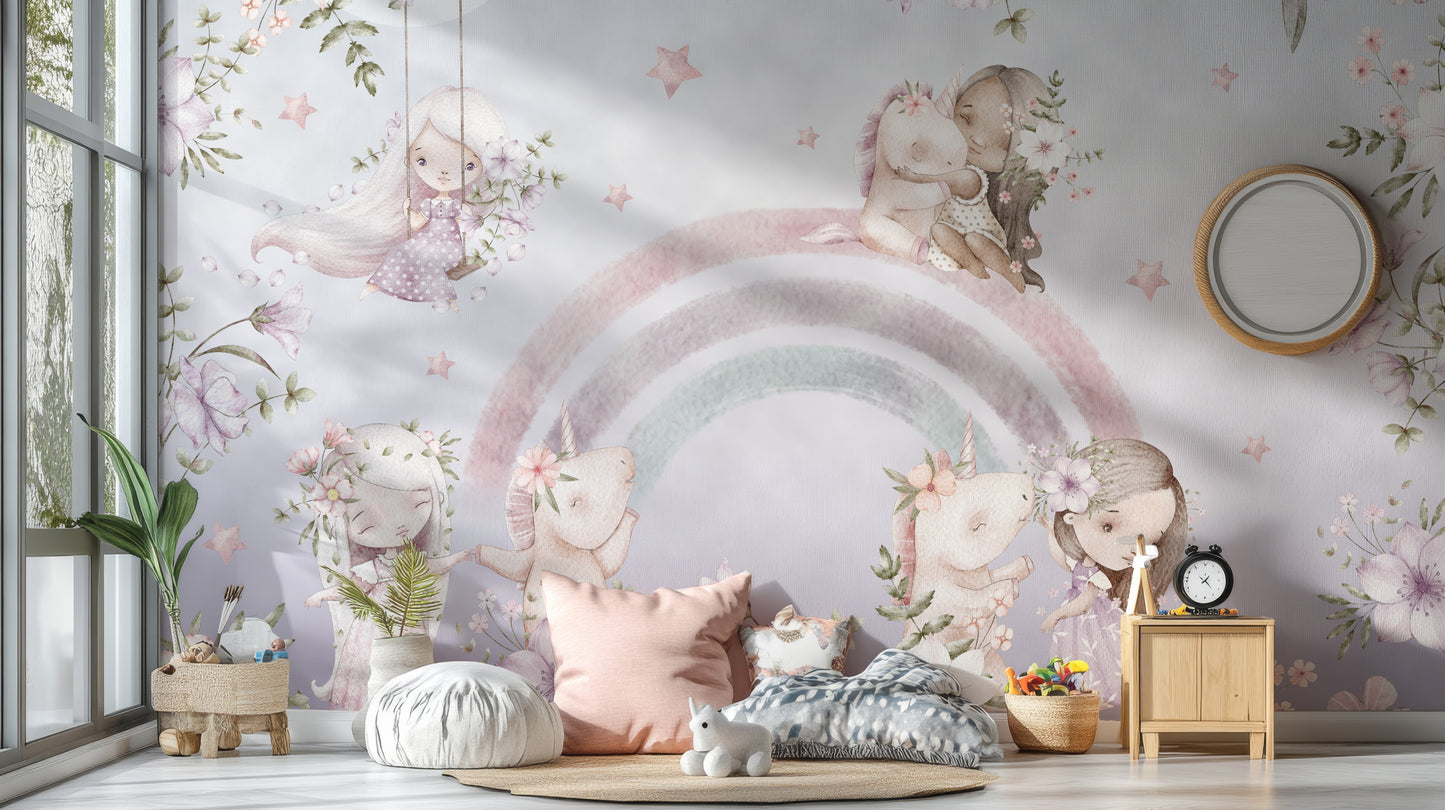 Soft-hued rainbow wallpaper with floral fairy unicorn design.
