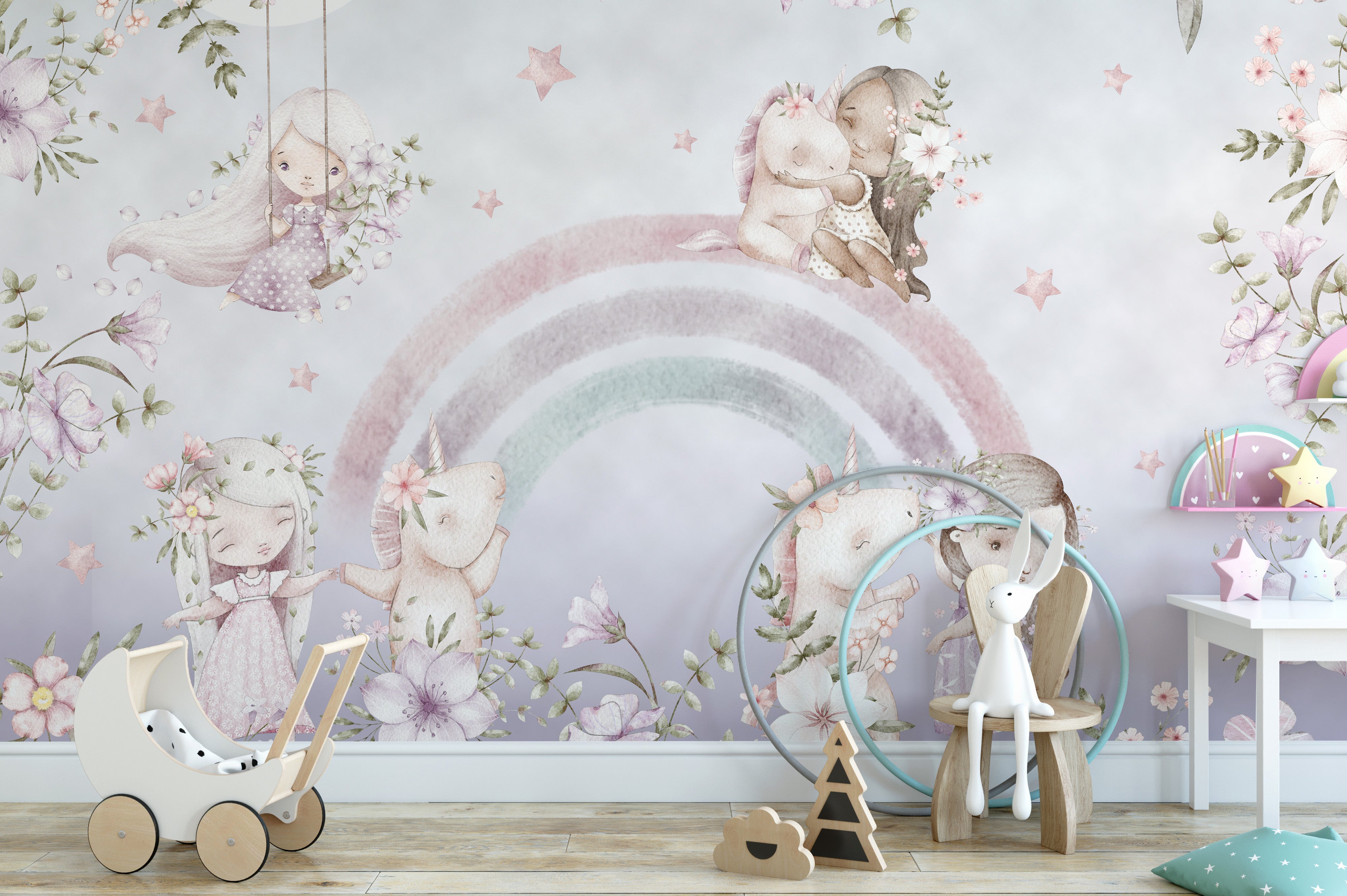 Kids' pastel rainbow wallpaper featuring fairytale unicorns.