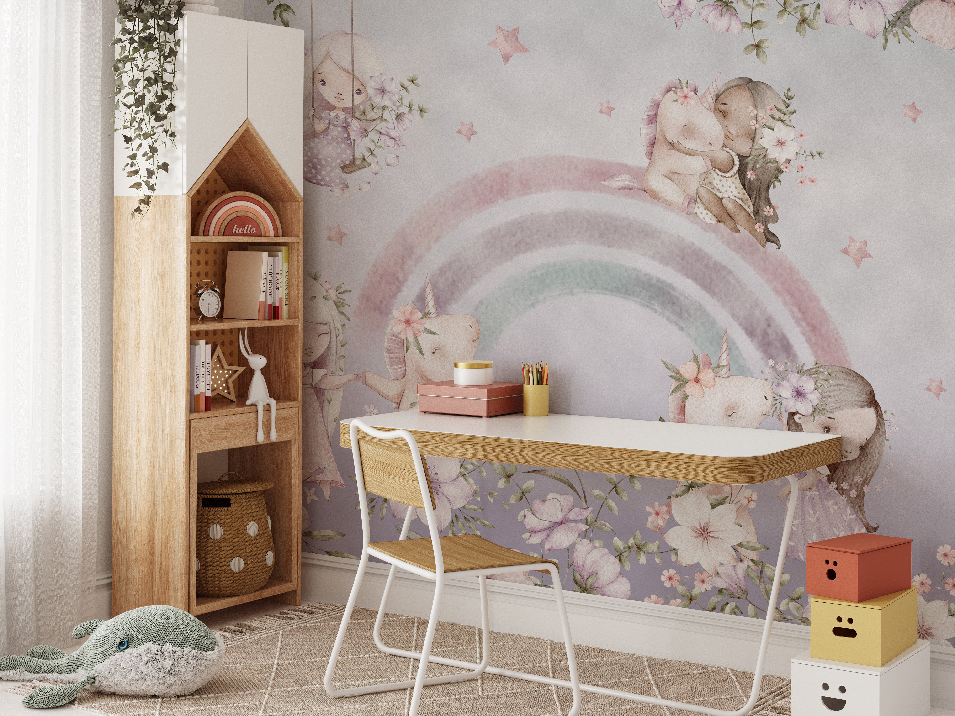Delight young minds with our whimsical rainbow wall mural, a charming addition to a girls room wallpaper collection. This mural blooms with pastel hues and playful imagery, fostering a nurturing environment where creativity takes flight. Watch as the room blossoms into a storybook scene, capturing the essence of childhood wonder. Each brushstroke tells a tale, making bedtimes and playtimes equally enchanting. Transform a girl's room into a fairy-tale garden where dreams are nurtured and adventures begin right at home.