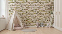 Bring the charm of a storybook forest to your home with this delightful wallpaper by Uta Naumann. This design shows cute watercolor animals having fun in a green and beige woodland setting. It features a deer, bunny, fox, and bear along with trees, flowers, and other natural elements, all in a soft palette. This wallpaper for walls is perfect for a nursery, kids' room, or playroom. The watercolor style and cute animal characters create a peaceful and joyful atmosphere. This design makes interiors feel cozy, calm and imaginative. It creates a space where children can feel like they are visiting a fairy tale.