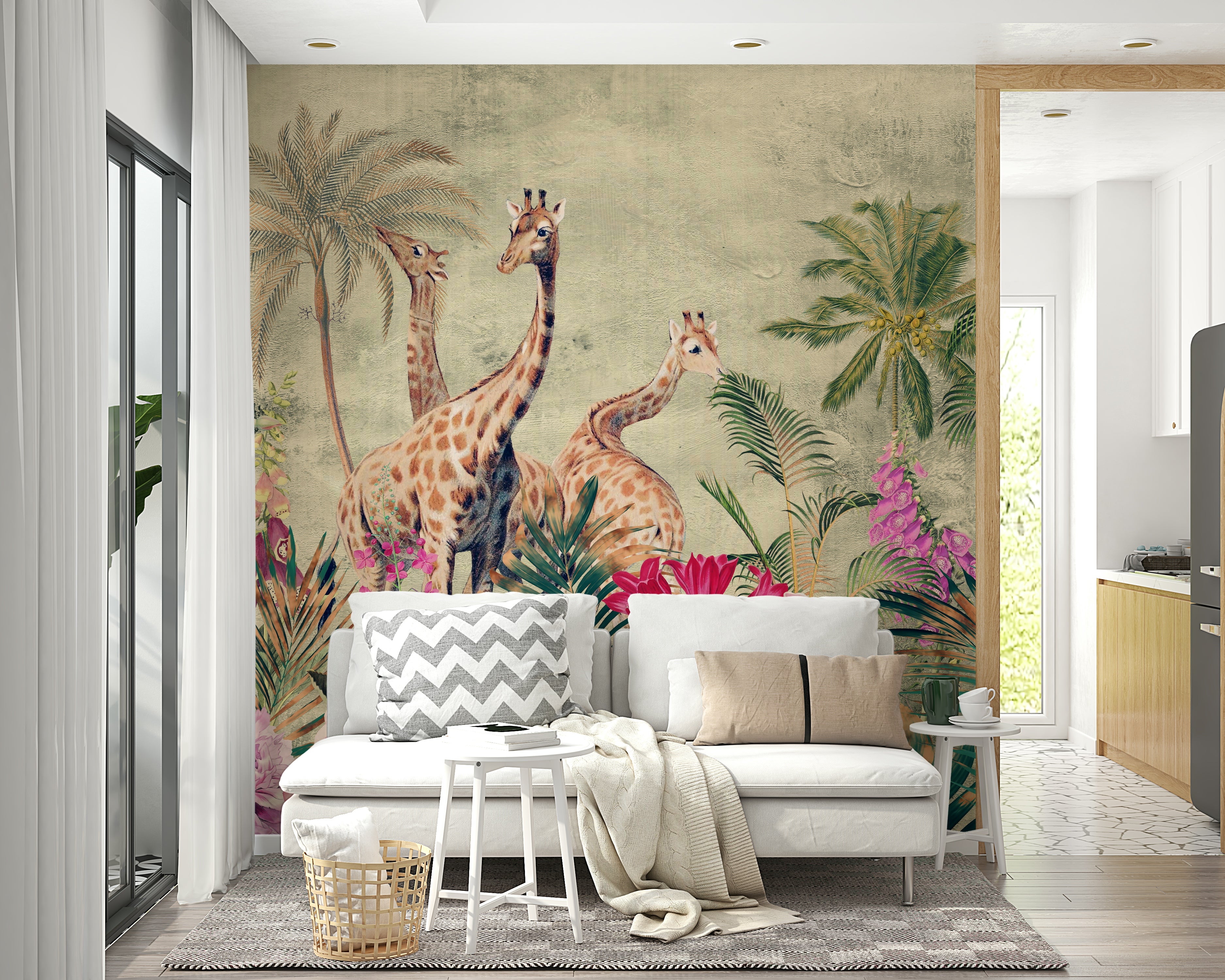 Escape to the serene beauty of the African savannah with this exquisite wallpaper. Three giraffes, rendered in a delicate watercolor style, stand majestically amidst a vibrant array of tropical flowers and palm trees. The soft, muted color palette evokes a sense of tranquil calm, while the detailed botanical elements add a touch of sophistication. This wallpaper is a perfect blend of nature's elegance and the wild beauty of Africa, ideal for creating a peaceful and captivating atmosphere.