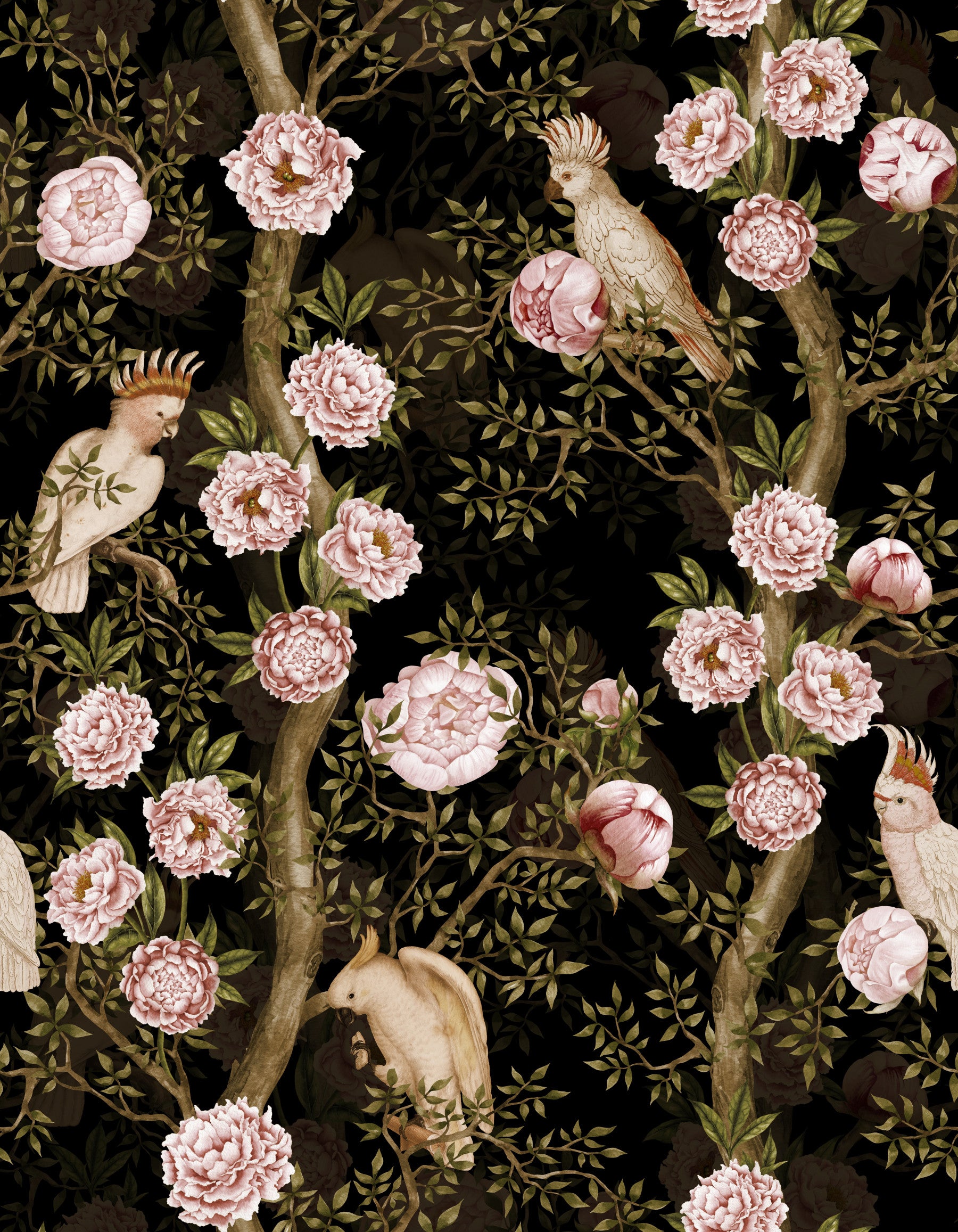 Journey to a hidden paradise with 'Whispers of the Tropics,' a stunning wallpaper showcasing the beauty of exotic flora and fauna. Delicate blush pink peonies intertwine with lush foliage, creating a vibrant and enchanting backdrop for majestic white cockatoos. The design evokes a sense of tranquility and natural splendor, transporting you to a tropical oasis. The use of watercolor techniques adds a soft, dreamlike quality, while the rich color palette brings energy and warmth to any space. This design is ideal for creating a luxurious and immersive escape in your bedroom, living room, or even a sophisticated bathroom.
