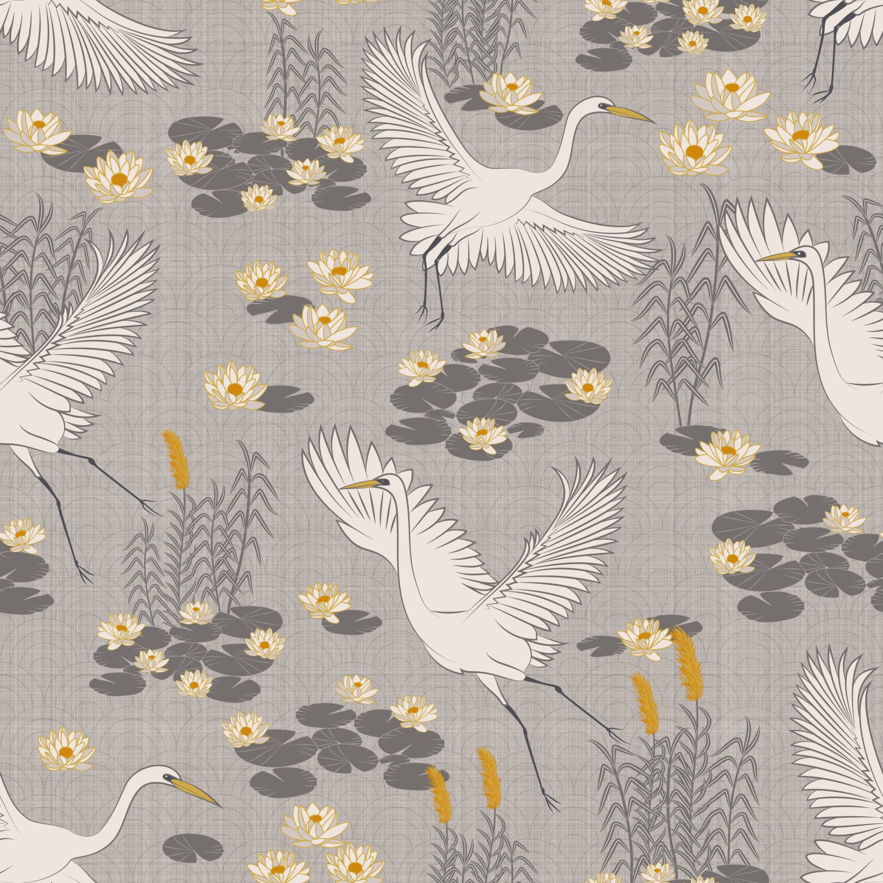 This wallpaper evokes a sense of tranquility with its elegant design. White cranes in graceful flight are depicted amidst a serene pond filled with delicate waterlily blossoms. The muted grey and beige background, textured like linen, adds a touch of sophistication. The subtle gold accents in the lotus flowers and reeds create a harmonious balance, enhancing the overall peaceful atmosphere. Ideal for creating a calming and sophisticated ambiance in any room, this wallpaper blends natural beauty with artistic finesse, creating a space of peaceful contemplation.