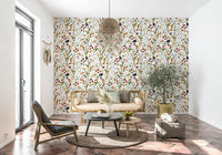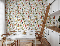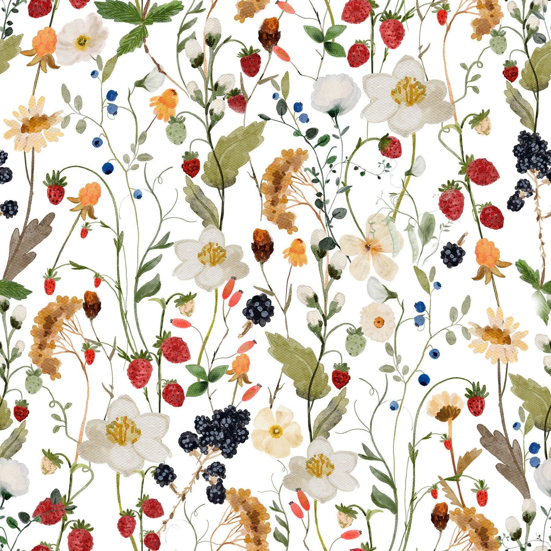 Invite the charm of an English garden indoors with this whimsical floral wallpaper by Uta Naumann for walls. Delicate watercolor illustrations display strawberries, blueberries, and blackberries among wildflowers, crafting a picturesque scene. Soft shades of red, blue, green, and beige blend on a white background, filling spaces with a serene atmosphere. Use it in a dining room to create a warm and inviting ambiance, or bring a touch of nature to your bedroom. This design enhances interiors with its peaceful and enchanting feel, adding character and grace.