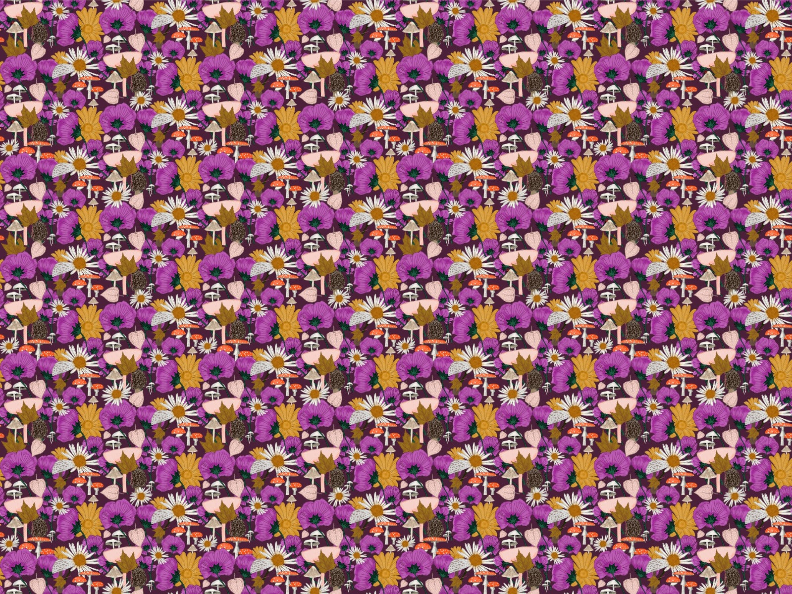Vibrant Wild Flowers and Mushrooms Purple Wallpaper