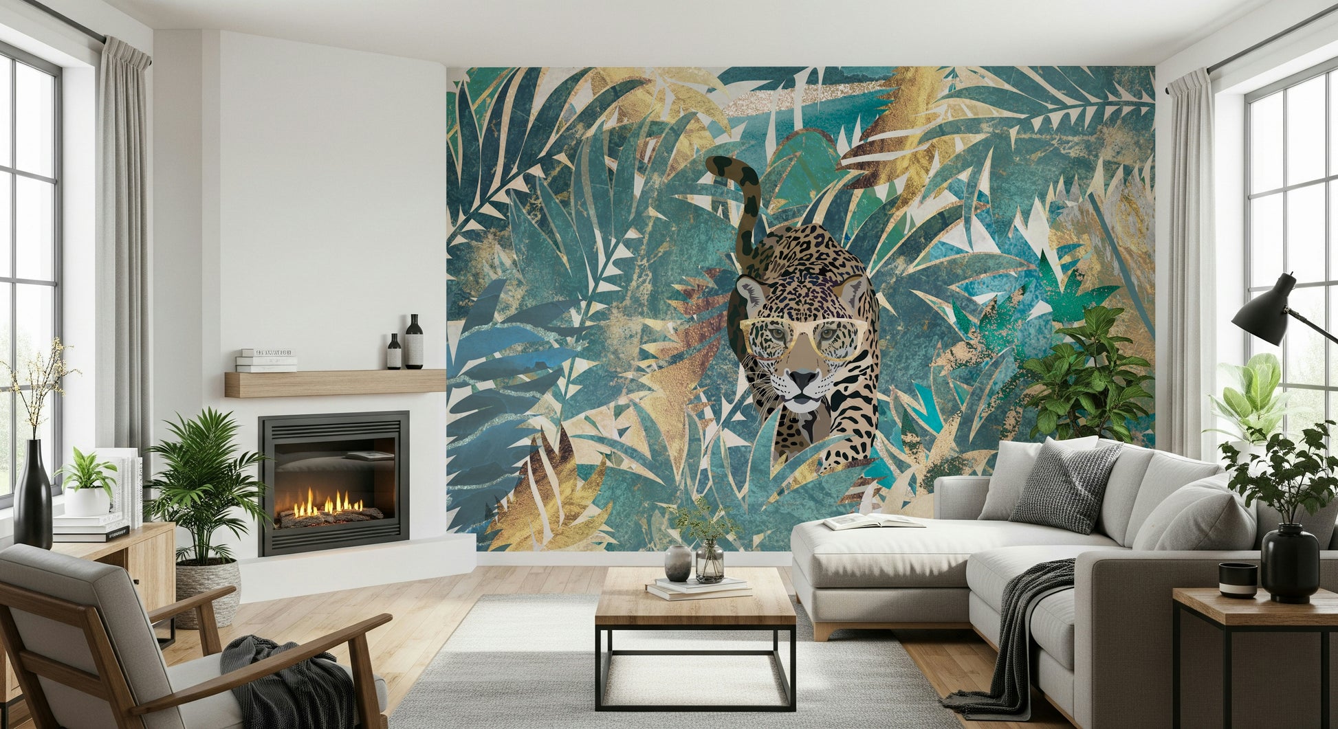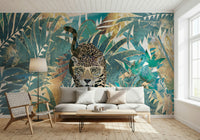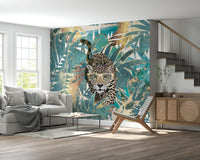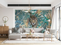 Bring the tropics home with this captivating wallpaper for walls. A cool jaguar hides among lush palm leaves. The art blends teal, gold, and brown tones for a visually appealing design. This peel-and-stick wallpaper transforms interiors, adding a unique focal point. Imagine it in a living room or bedroom, complementing modern decor. Its blend of nature and sophistication makes it ideal for stylish homes. Let this jungle theme bring life and intrigue to your space.