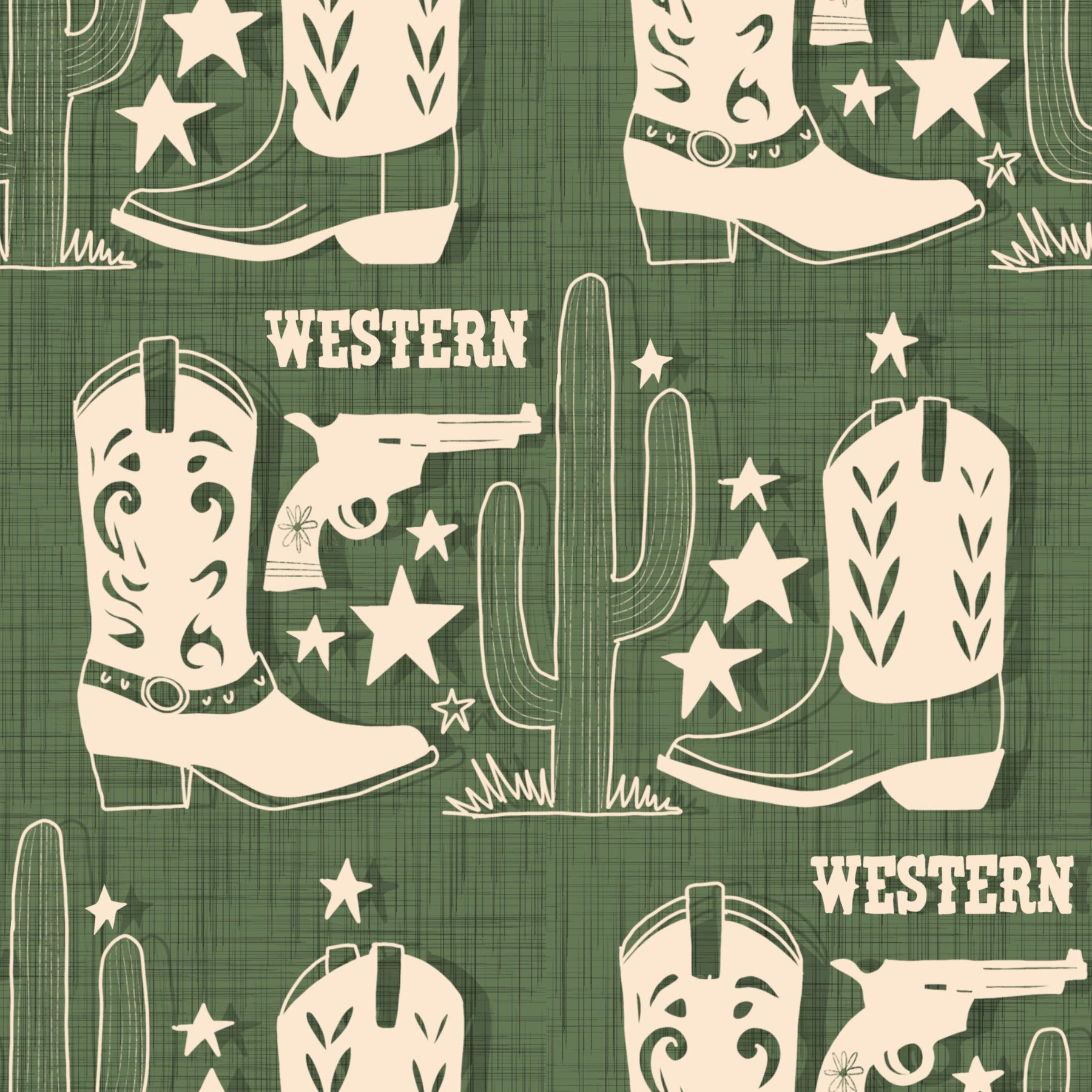 Wild West Charm wallpaper featuring cowboy boots, cacti, pistols, and stars on a rustic green background.