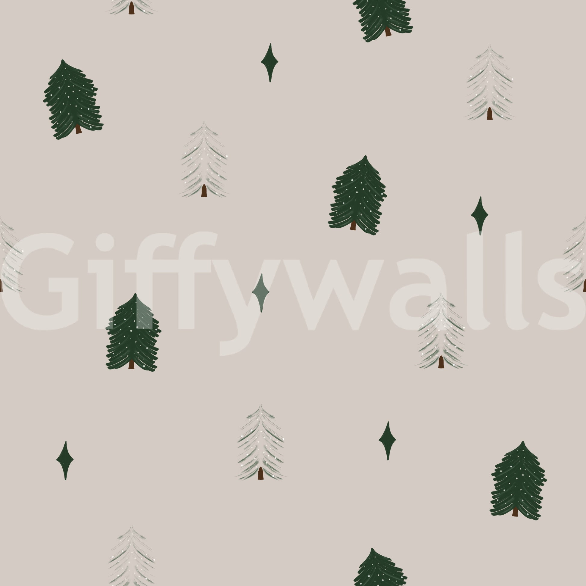 Embrace the quiet beauty of winter with this charming tree pattern. Dark green and light green conifers with snowfall mingle with diamond shaped elements against a neutral background. This wallpaper for walls brings a touch of the serene forest into your home. Its gentle color palette works wonders in a bedroom, living room, or even a cozy reading nook. Let the calming design transform your space into a peaceful escape.